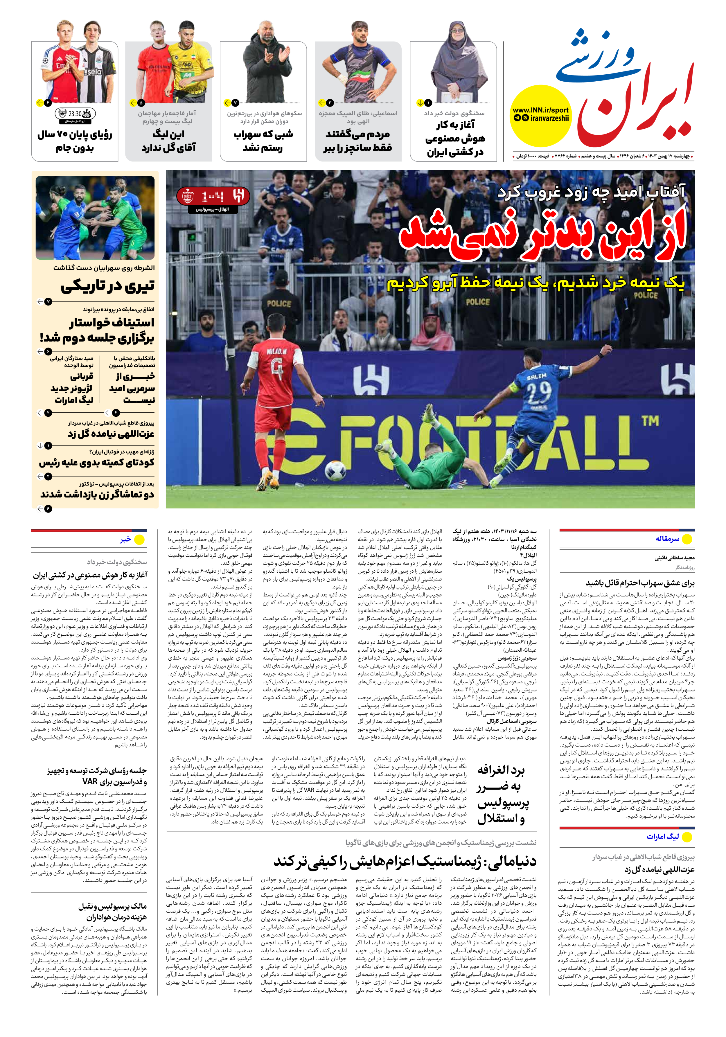 روزنامه ایران ورزشی - شماره هفت هزار و هفتصد و شصت و دو - ۱۷ بهمن ۱۴۰۳