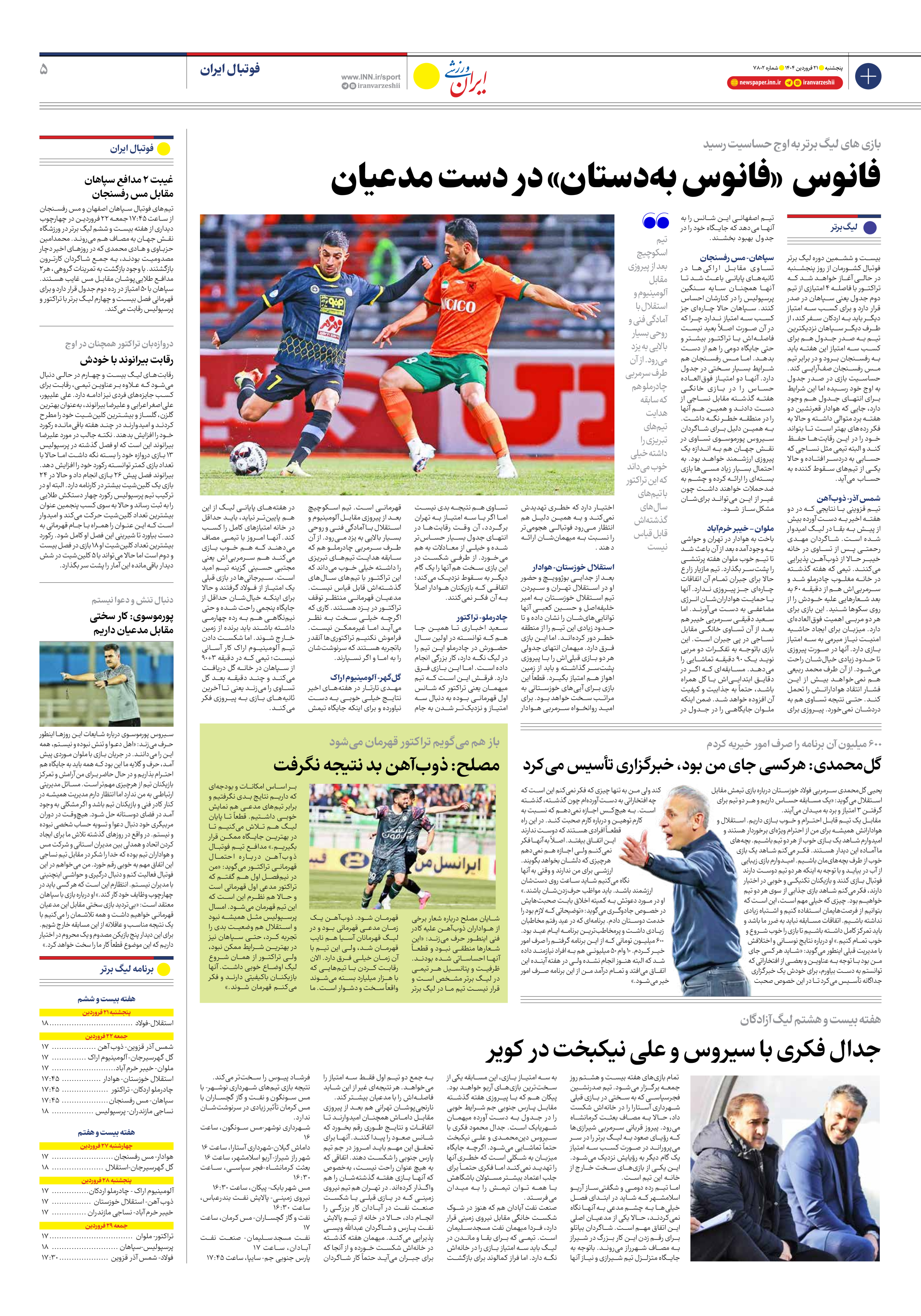 روزنامه ایران ورزشی - شماره هفت هزار و هشتصد و دو - ۲۱ فروردین ۱۴۰۴ - صفحه ۵