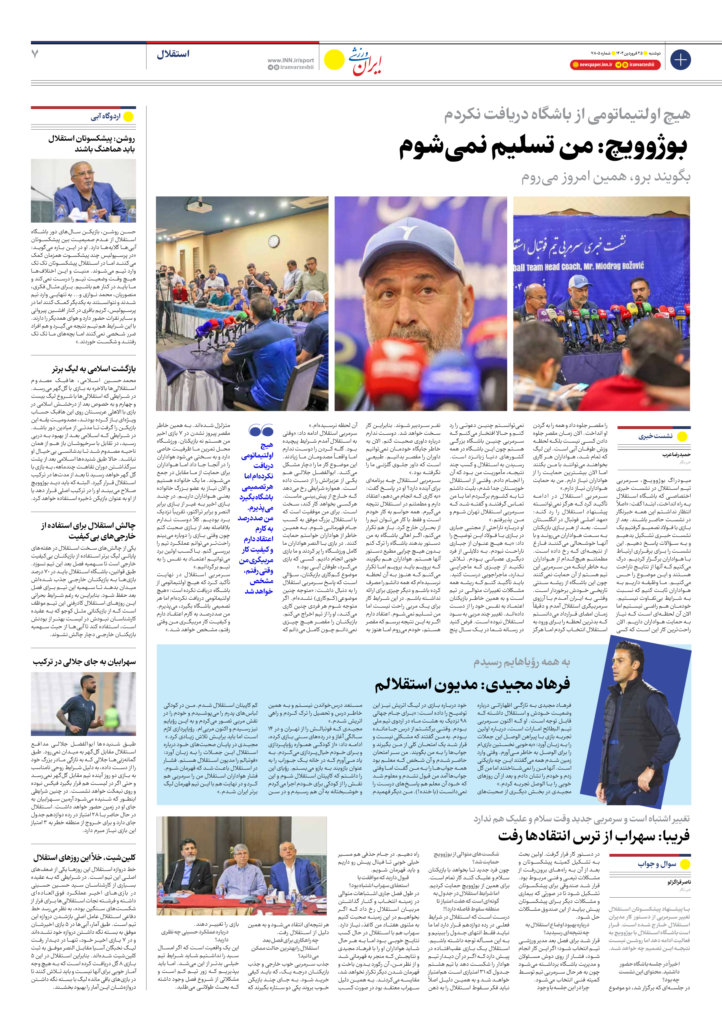 روزنامه ایران ورزشی - شماره هفت هزار و هشتصد و پنج - ۲۵ فروردین ۱۴۰۴ - صفحه ۷