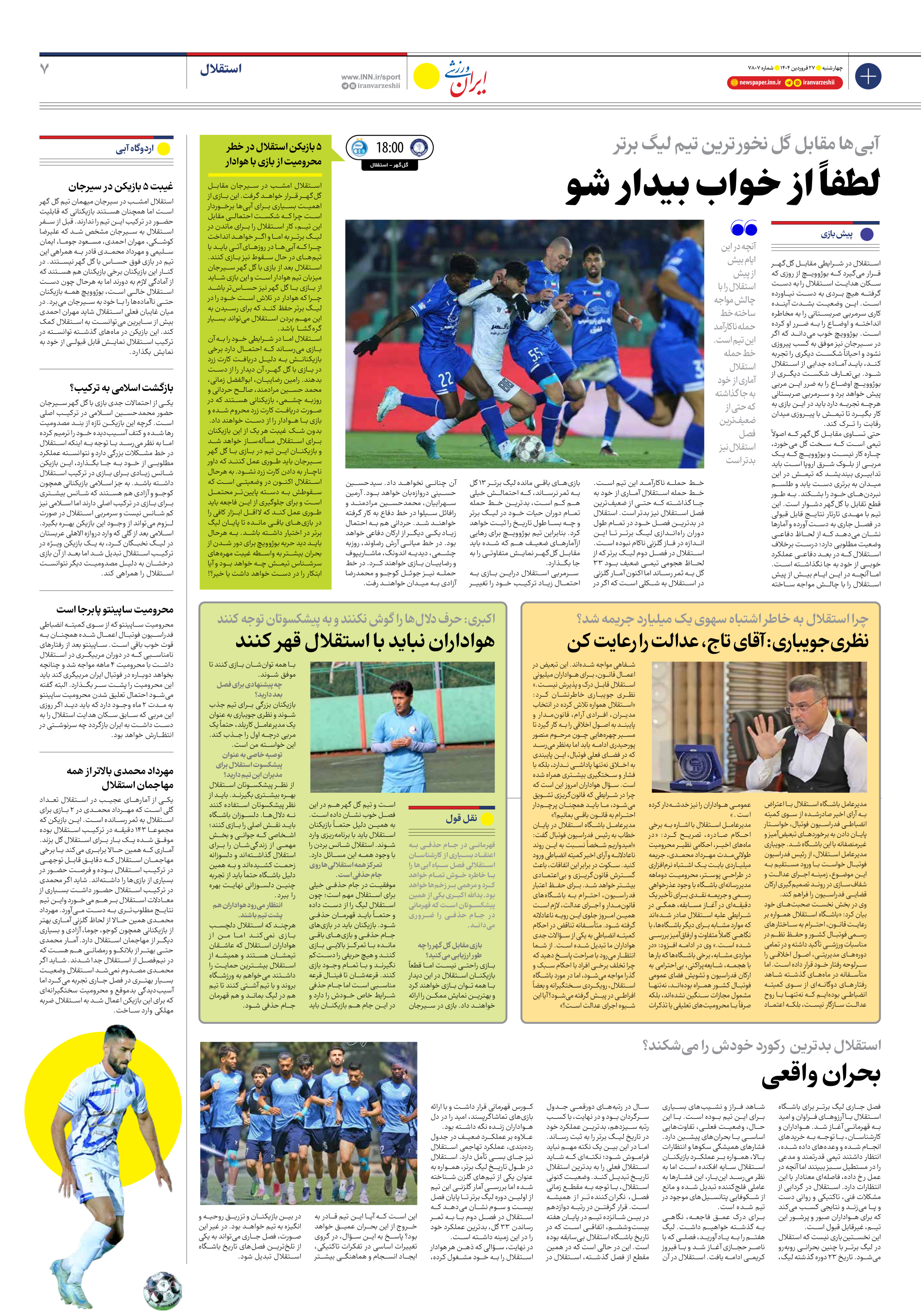 روزنامه ایران ورزشی - شماره هفت هزار و هشتصد و هفت - ۲۷ فروردین ۱۴۰۴ - صفحه ۷