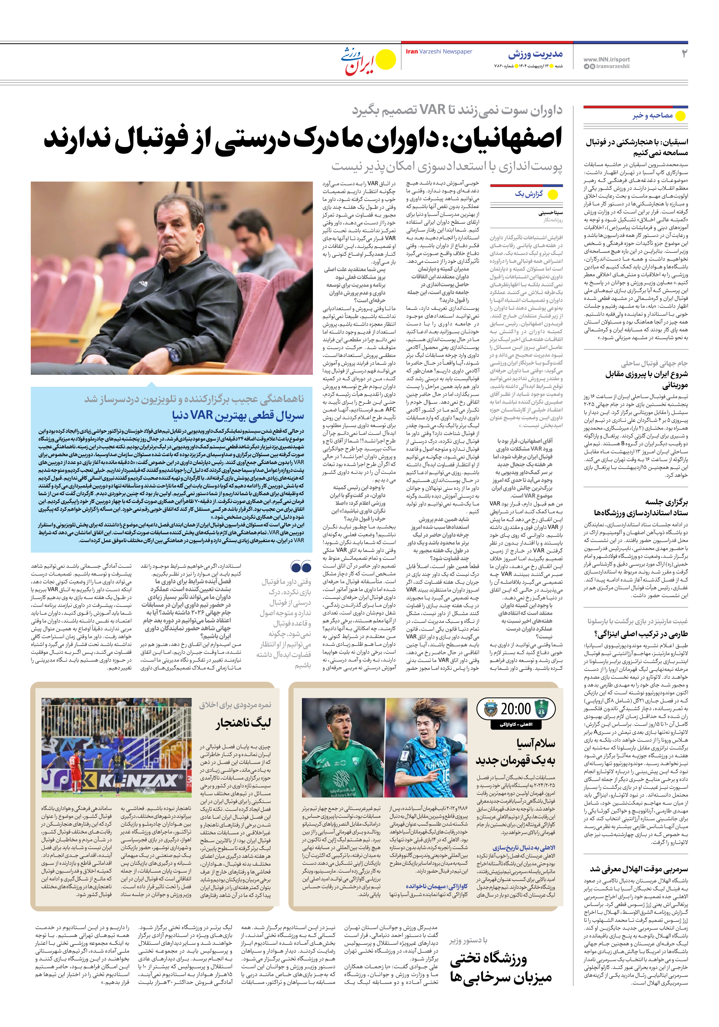 روزنامه ایران ورزشی - شماره هفت هزار و هشتصد و بیست - ۱۳ اردیبهشت ۱۴۰۴ - صفحه ۲