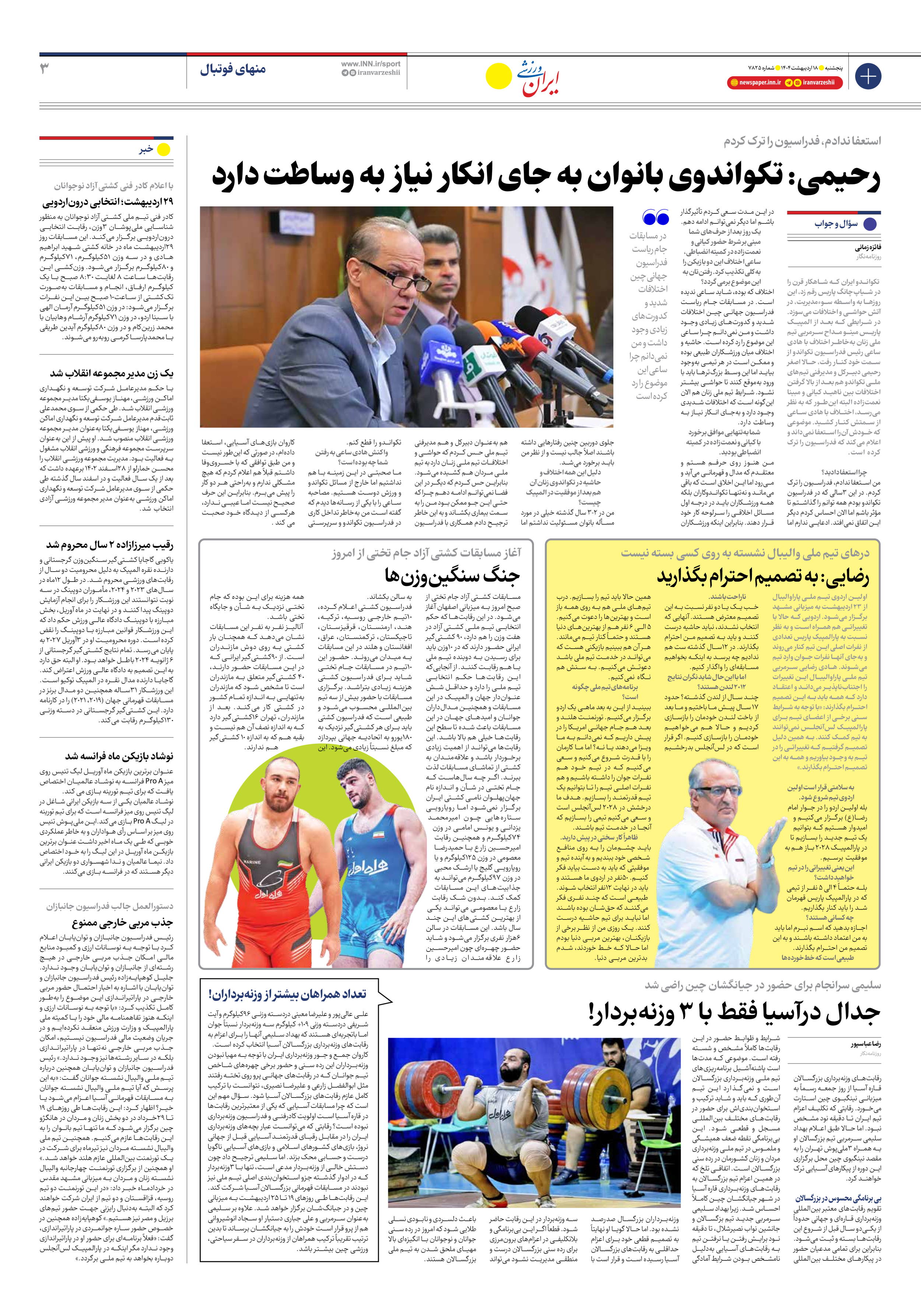 روزنامه ایران ورزشی - شماره هفت هزار و هشتصد و بیست و پنج - ۱۸ اردیبهشت ۱۴۰۴ - صفحه ۳