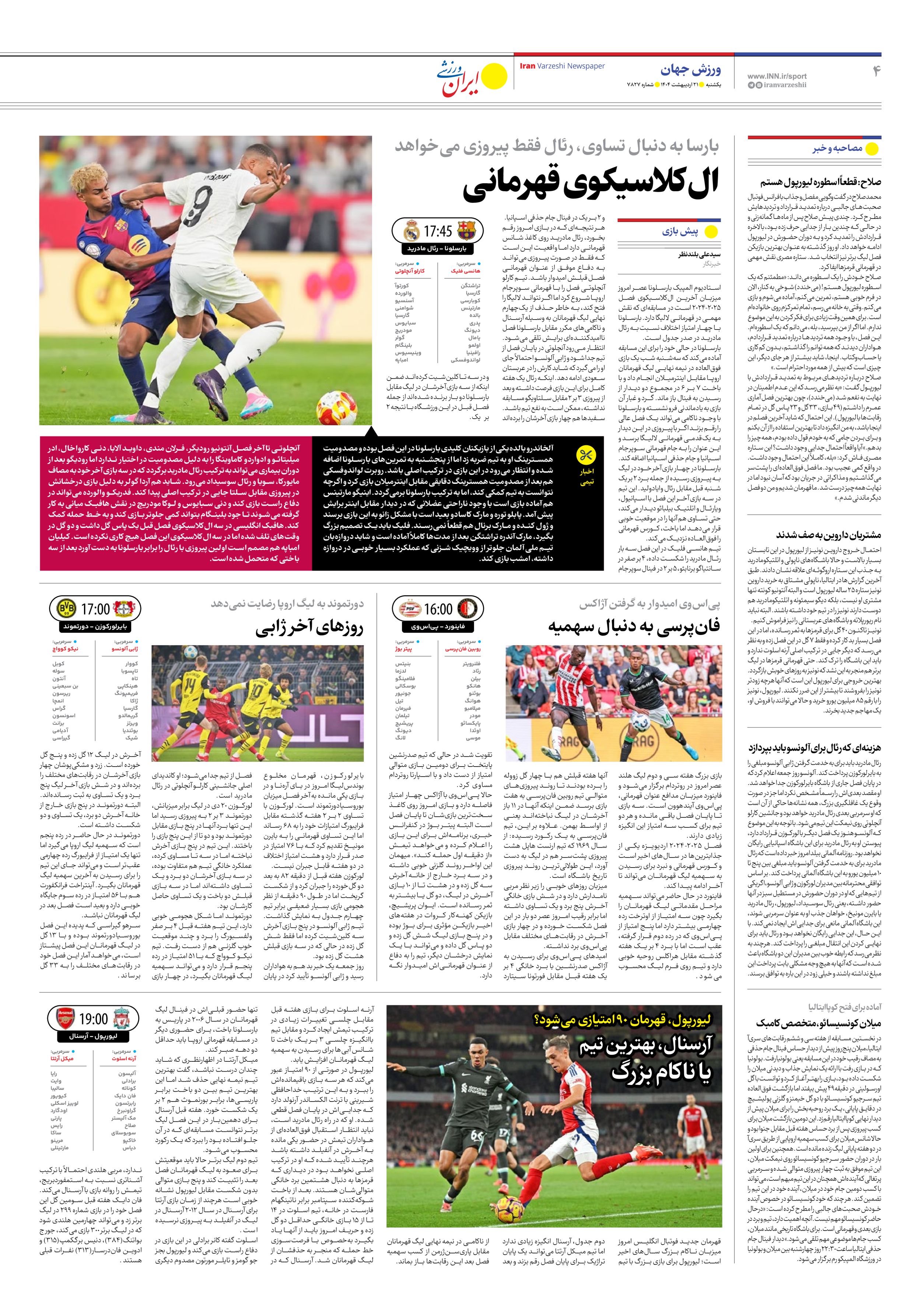 روزنامه ایران ورزشی - شماره هفت هزار و هشتصد و بیست و هفت - ۲۱ اردیبهشت ۱۴۰۴ - صفحه ۴