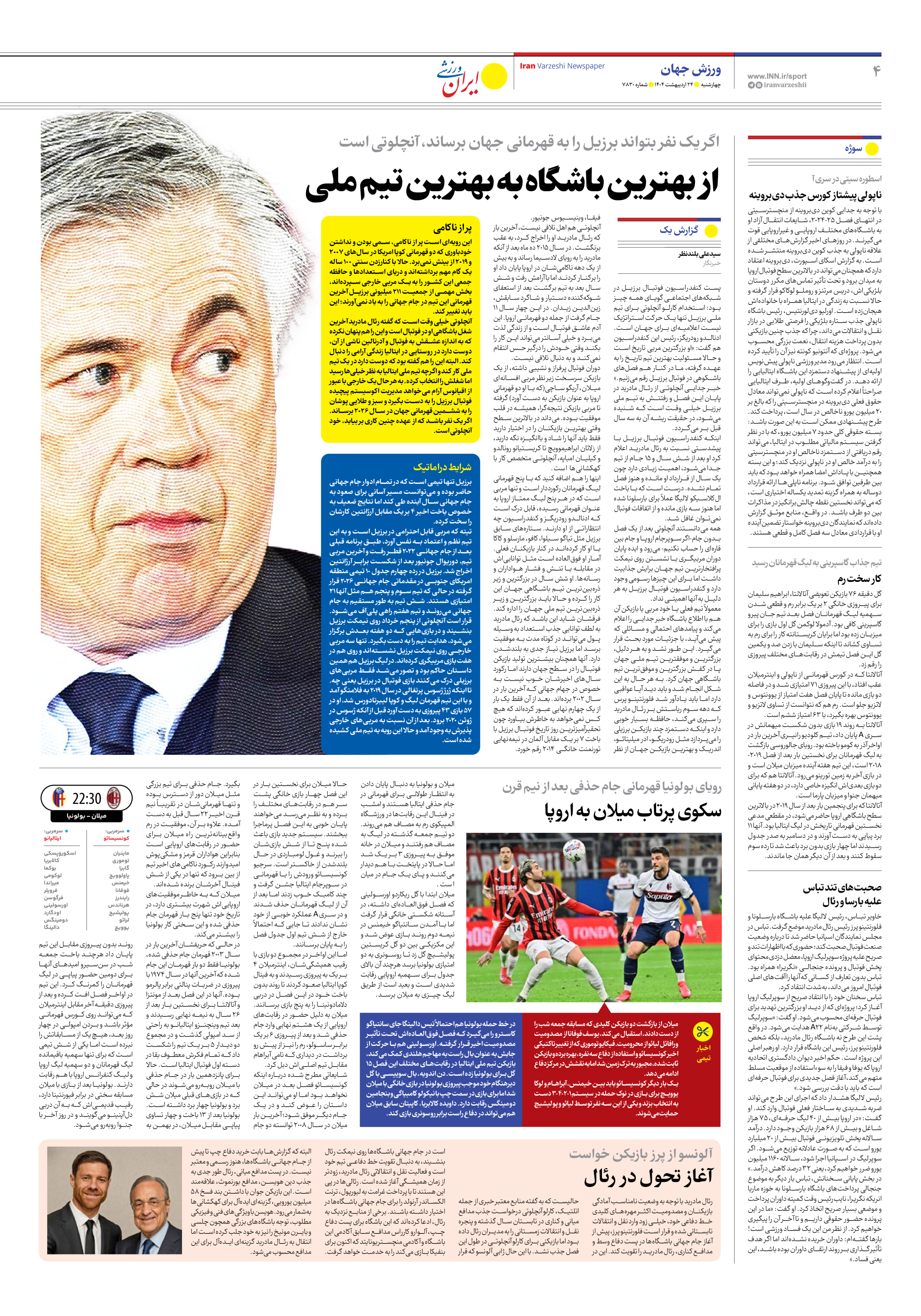روزنامه ایران ورزشی - شماره هفت هزار و هشتصد و سی - ۲۴ اردیبهشت ۱۴۰۴ - صفحه ۴