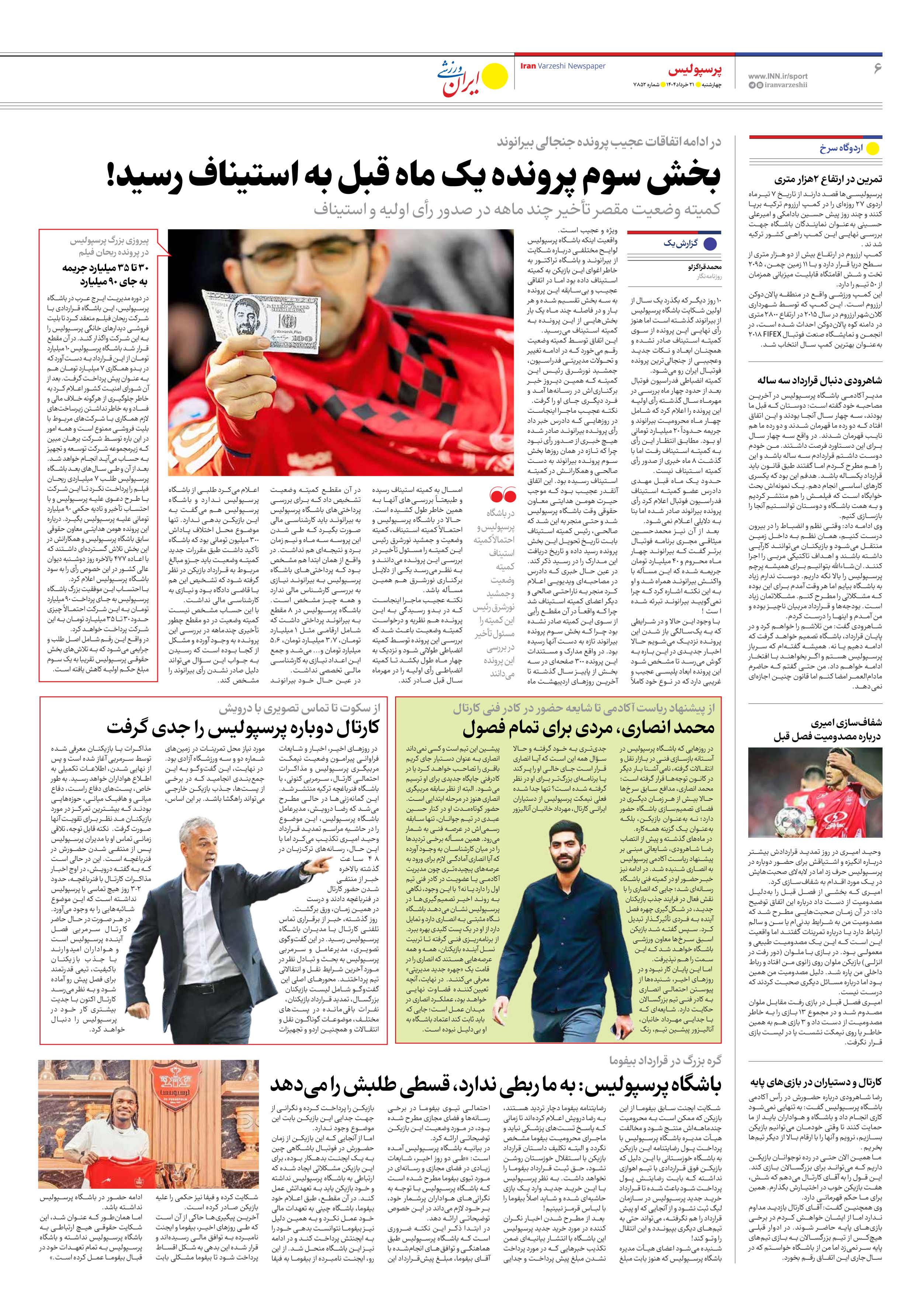 روزنامه ایران ورزشی - شماره هفت هزار و هشتصد و پنجاه و دو - ۲۱ خرداد ۱۴۰۴ - صفحه ۶