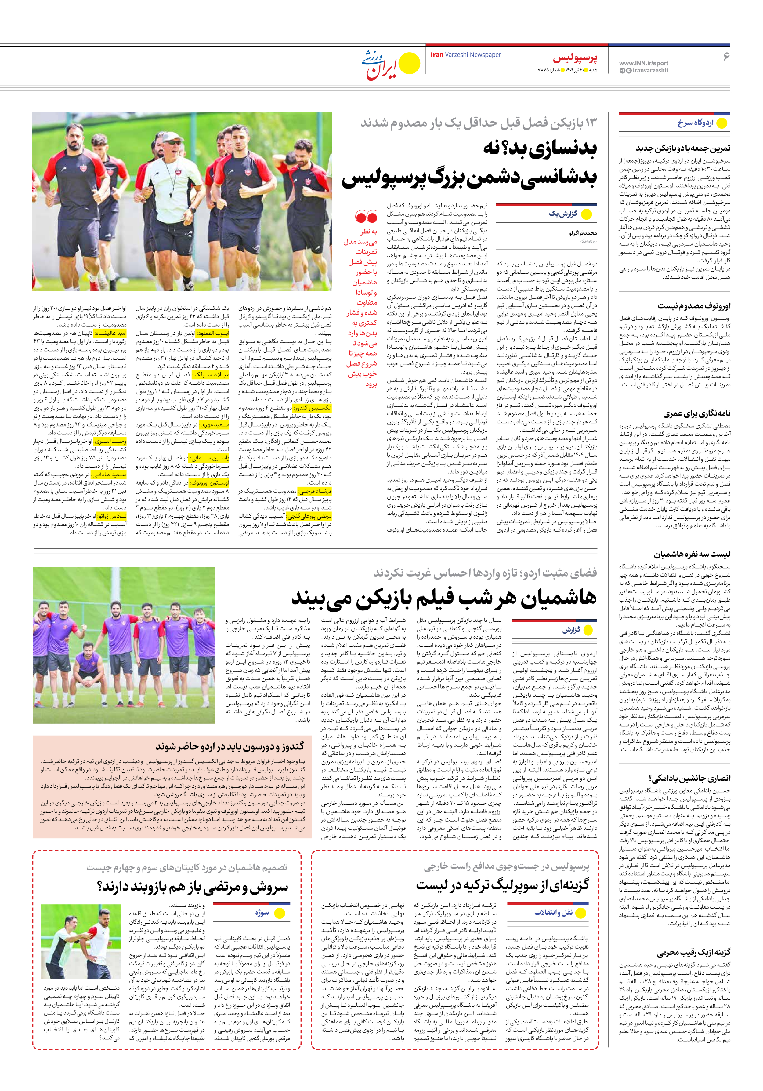 روزنامه ایران ورزشی - شماره هفت هزار و هشتصد و هفتاد و پنج - ۲۱ تیر ۱۴۰۴ - صفحه ۶