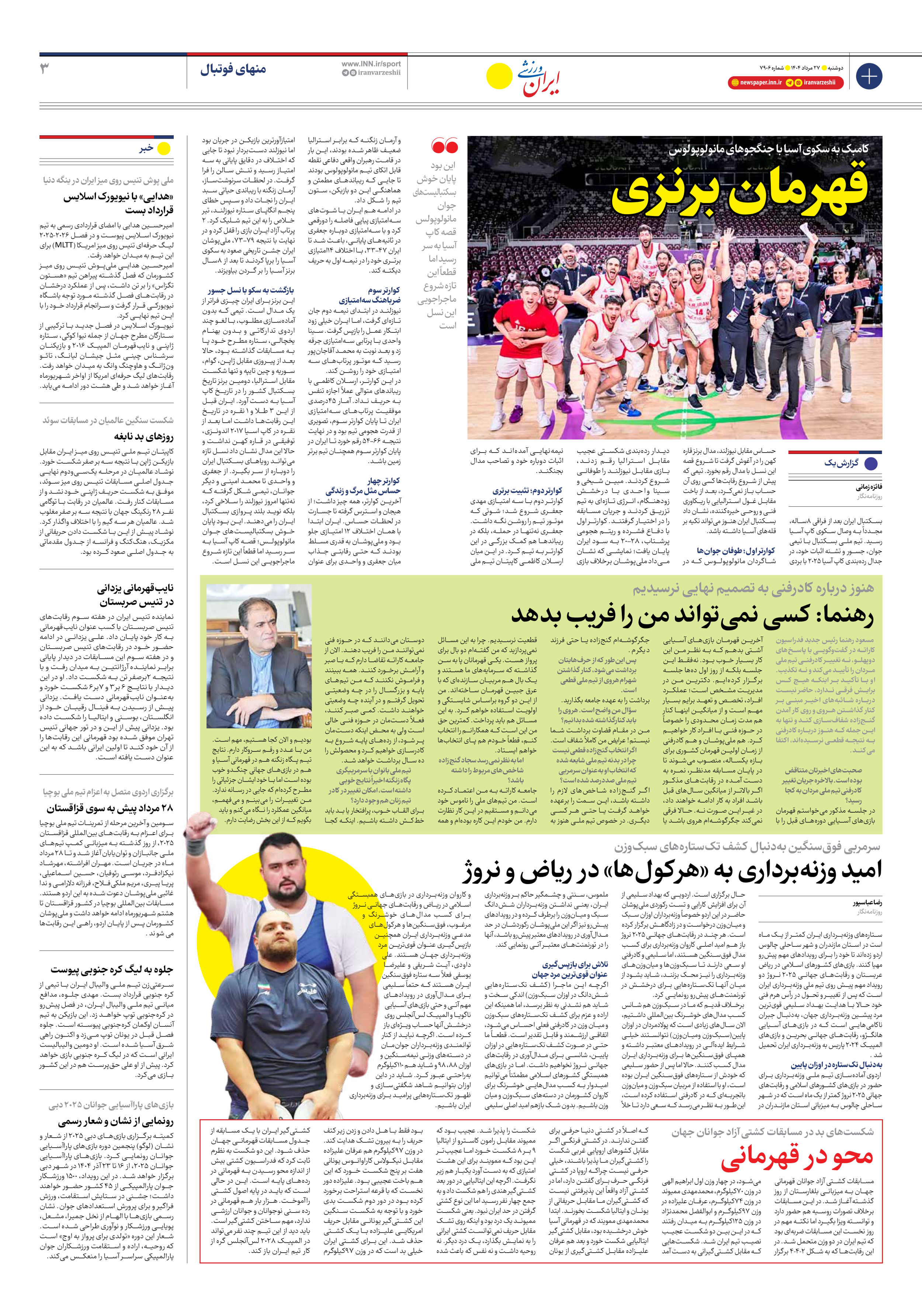 روزنامه ایران ورزشی - شماره هفت هزار و نهصد و شش - ۲۷ مرداد ۱۴۰۴ - صفحه ۳