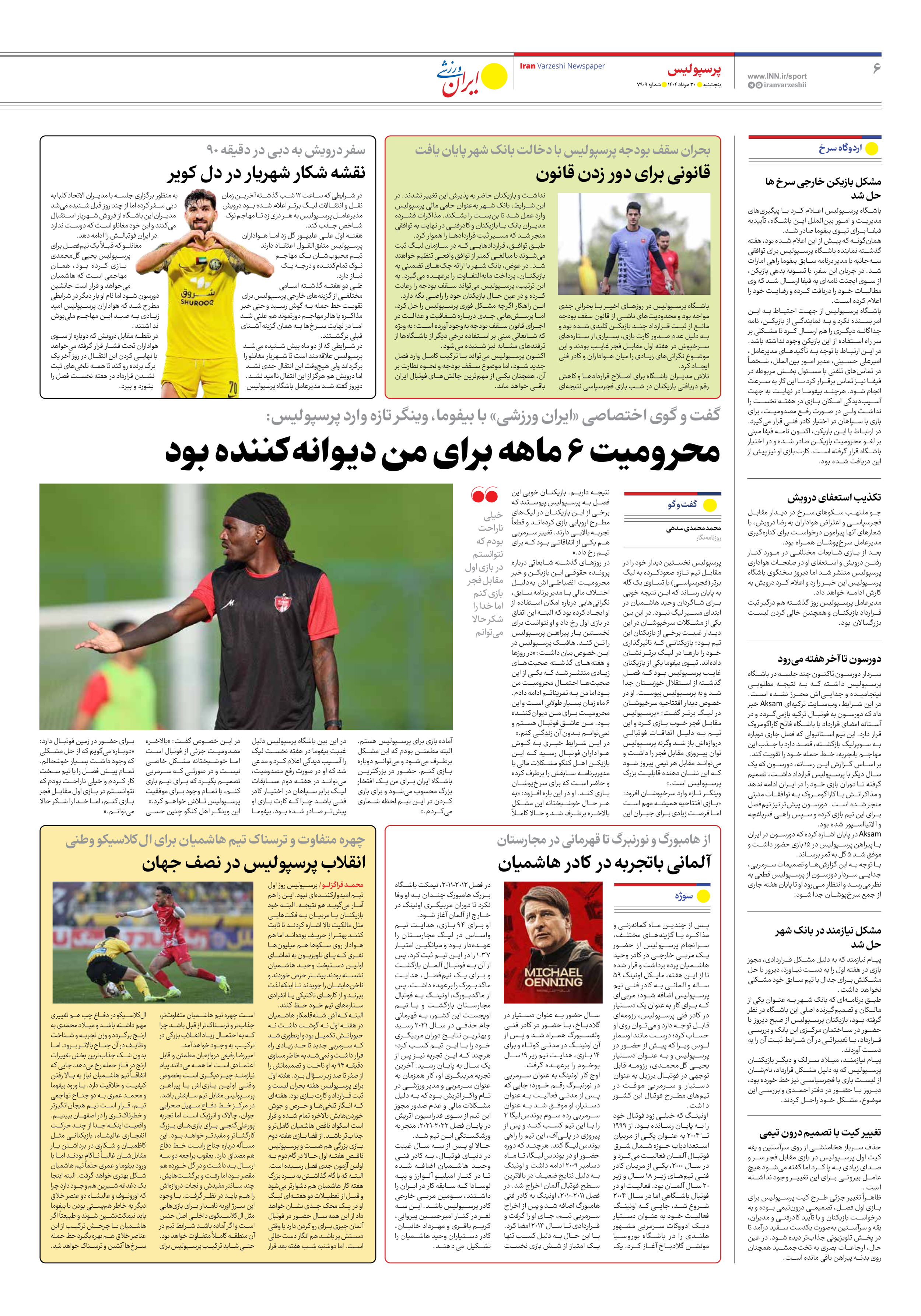 روزنامه ایران ورزشی - شماره هفت هزار و نهصد و نه - ۳۰ مرداد ۱۴۰۴ - صفحه ۶