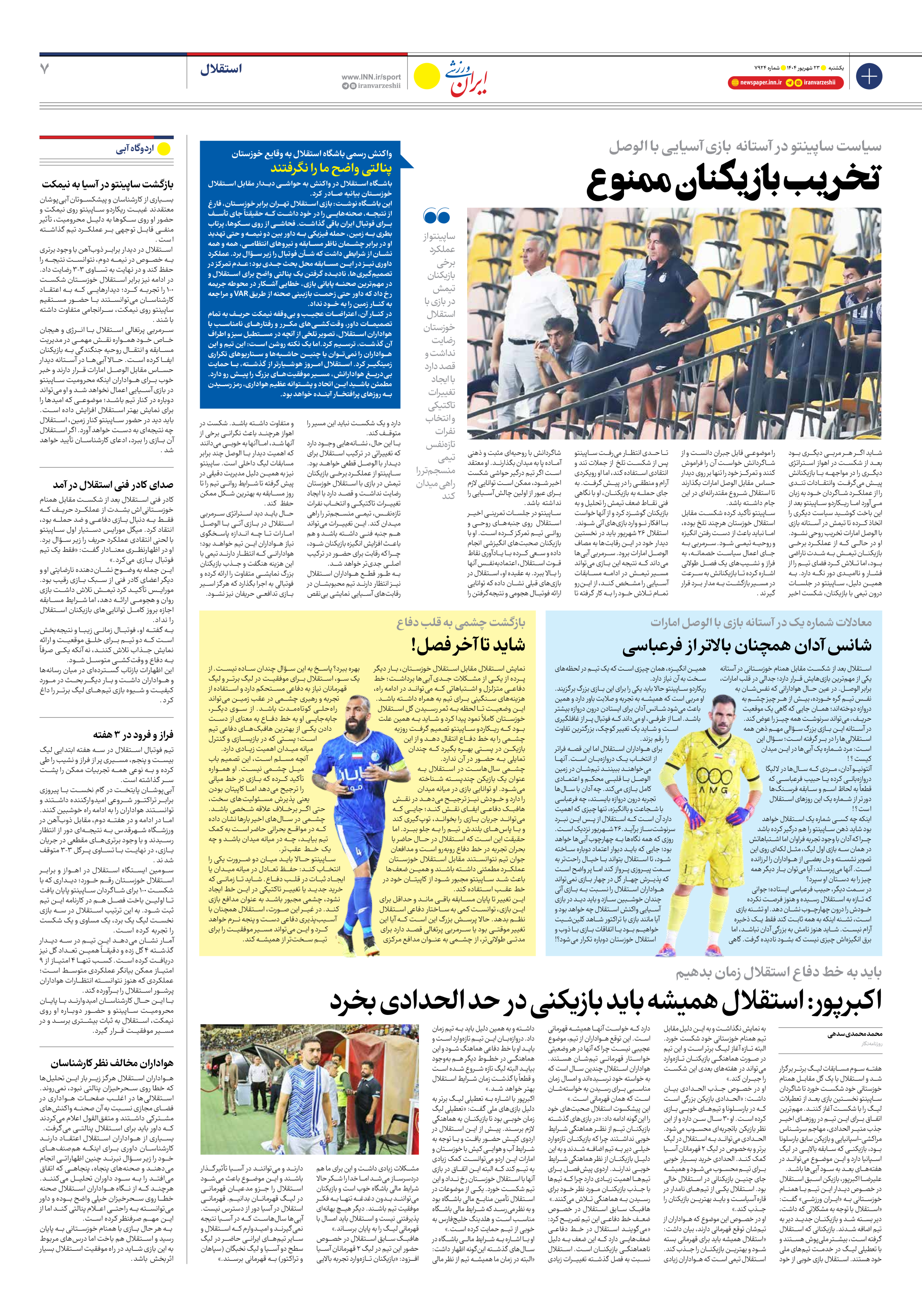 روزنامه ایران ورزشی - شماره هفت هزار و نهصد و بیست و چهار - ۲۳ شهریور ۱۴۰۴ - صفحه ۷