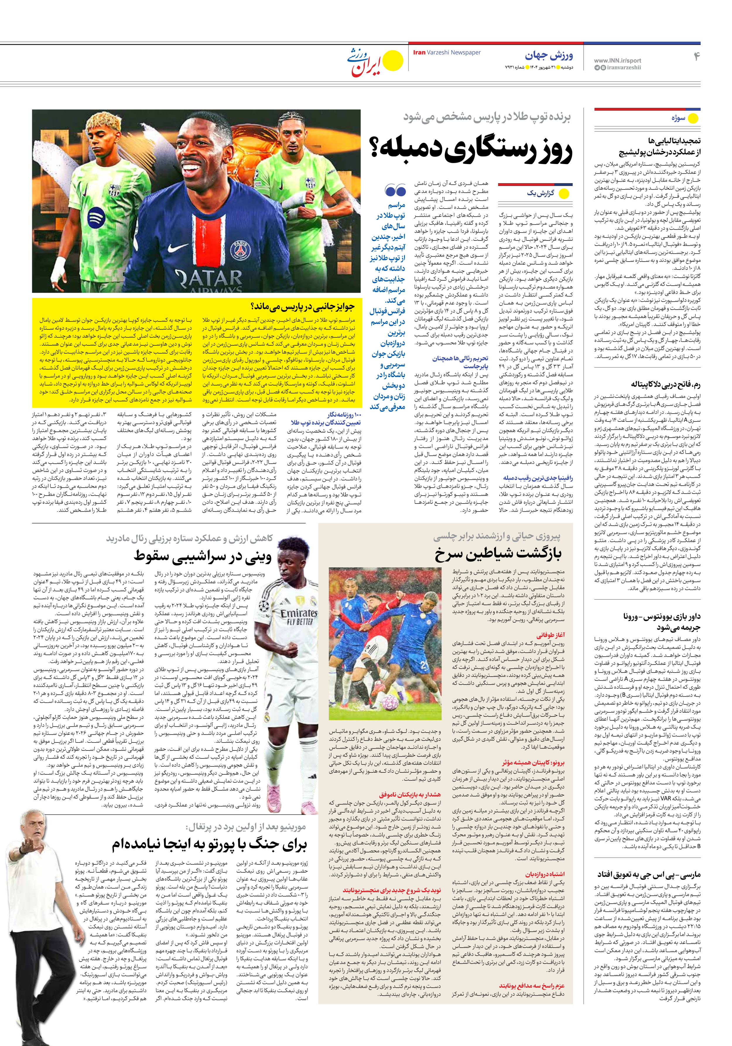 روزنامه ایران ورزشی - شماره هفت هزار و نهصد و سی و یک - ۳۱ شهریور ۱۴۰۴ - صفحه ۴