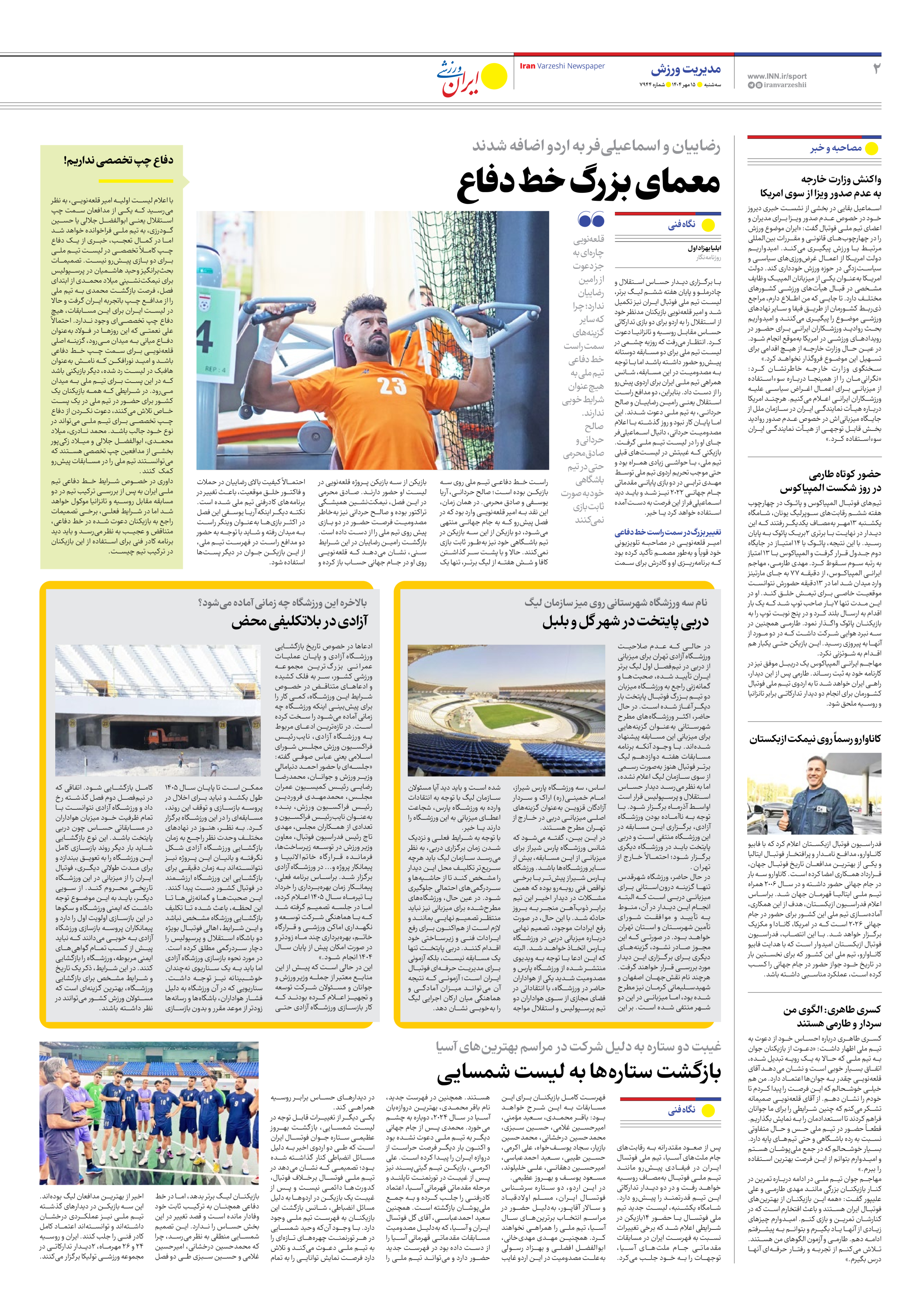 روزنامه ایران ورزشی - شماره هفت هزار و نهصد و چهل و چهار - ۱۵ مهر ۱۴۰۴ - صفحه ۲