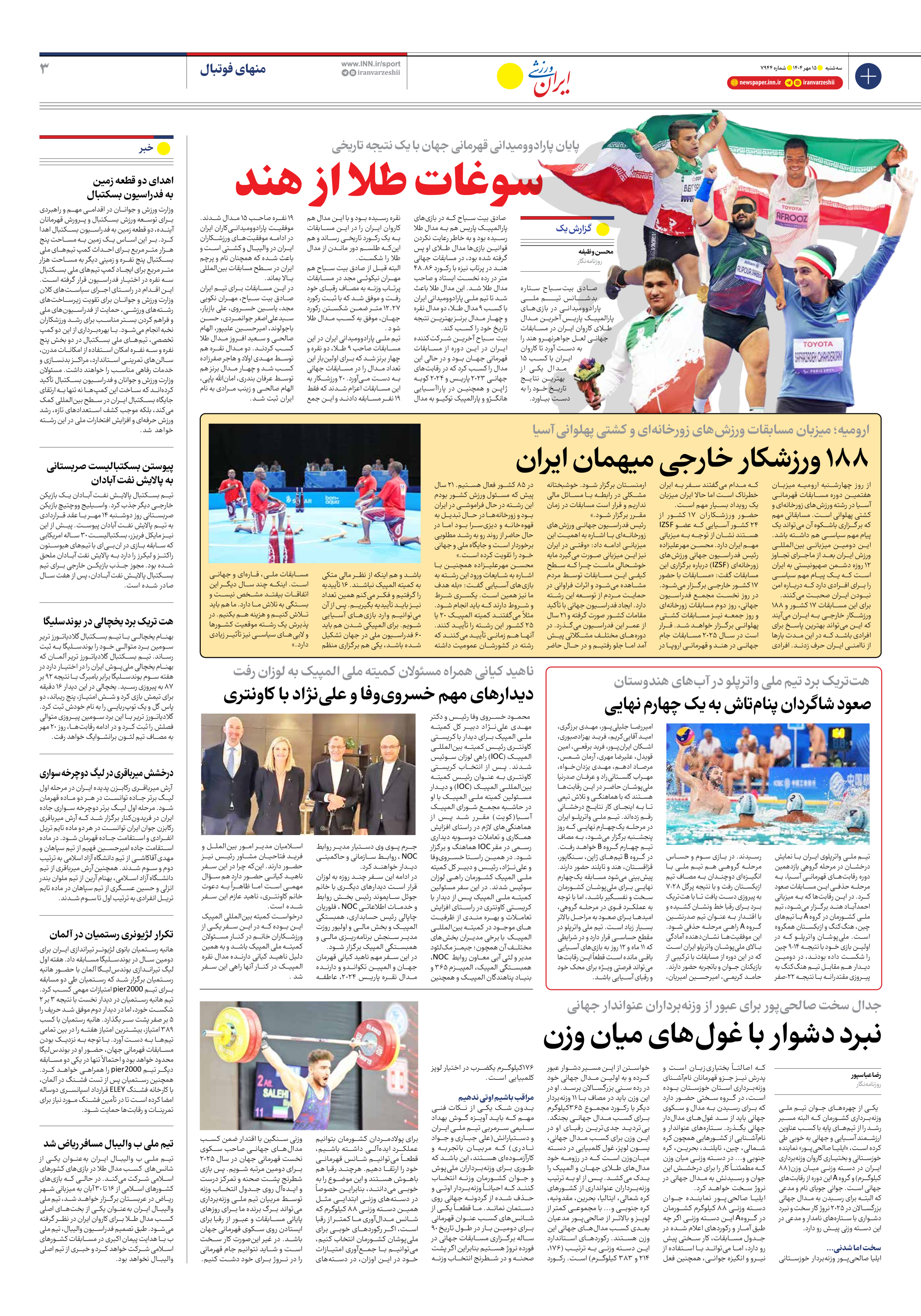 روزنامه ایران ورزشی - شماره هفت هزار و نهصد و چهل و چهار - ۱۵ مهر ۱۴۰۴ - صفحه ۳