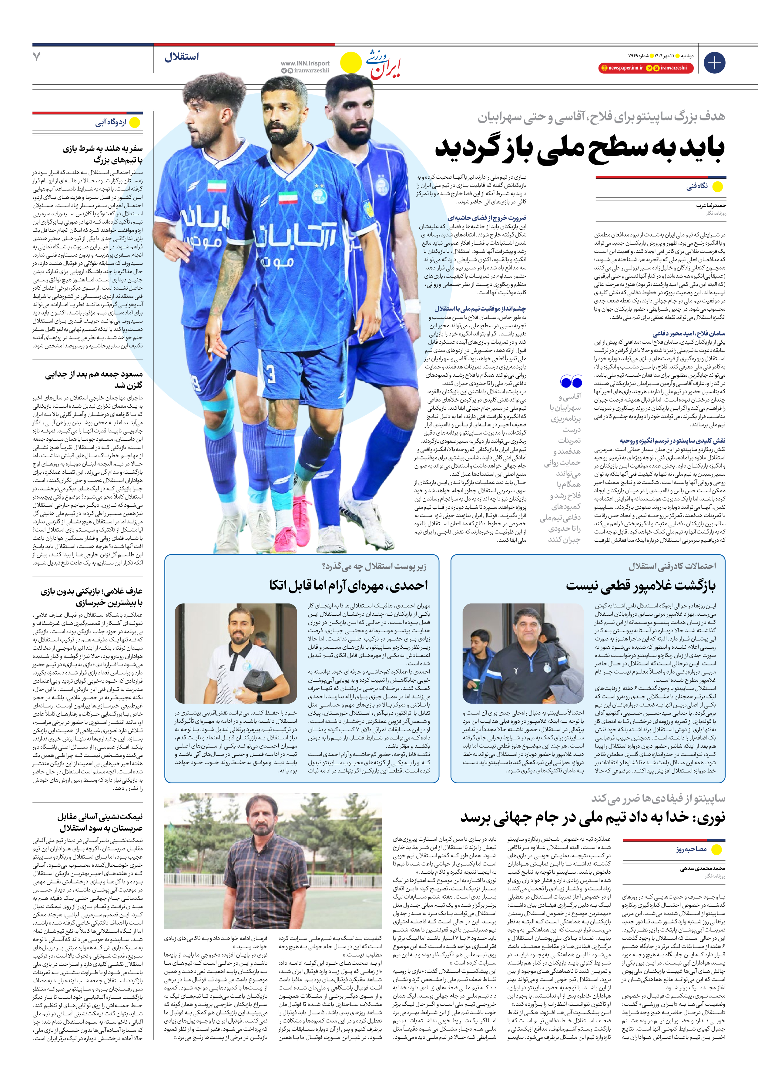 روزنامه ایران ورزشی - شماره هفت هزار و نهصد و چهل و نه - ۲۱ مهر ۱۴۰۴ - صفحه ۷