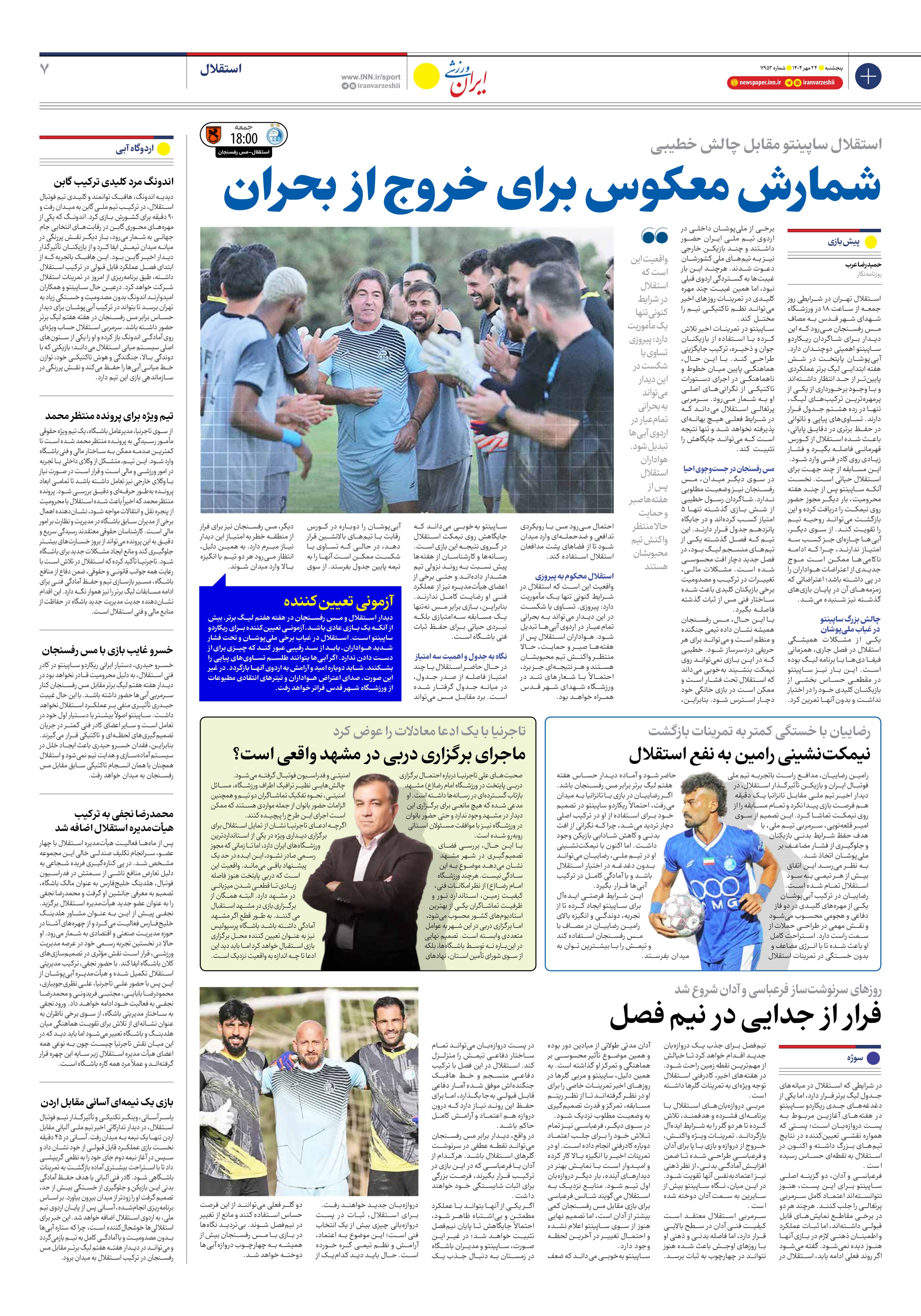 روزنامه ایران ورزشی - شماره هفت هزار و نهصد و پنجاه و دو - ۲۴ مهر ۱۴۰۴ - صفحه ۷