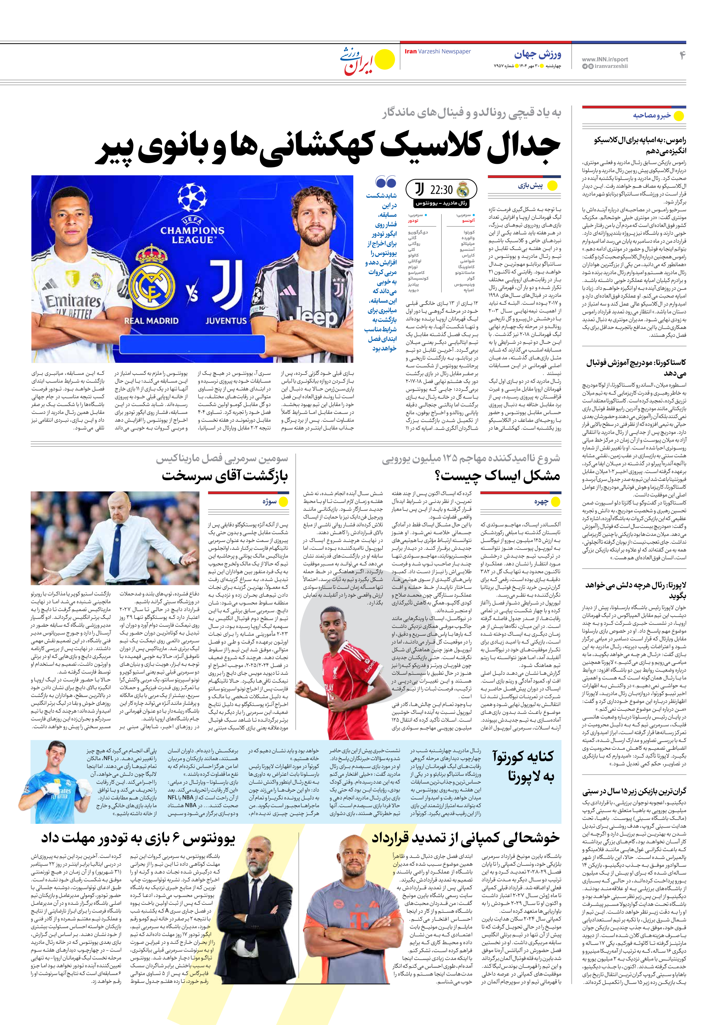 روزنامه ایران ورزشی - شماره هفت هزار و نهصد و پنجاه و هفت - ۳۰ مهر ۱۴۰۴ - صفحه ۴