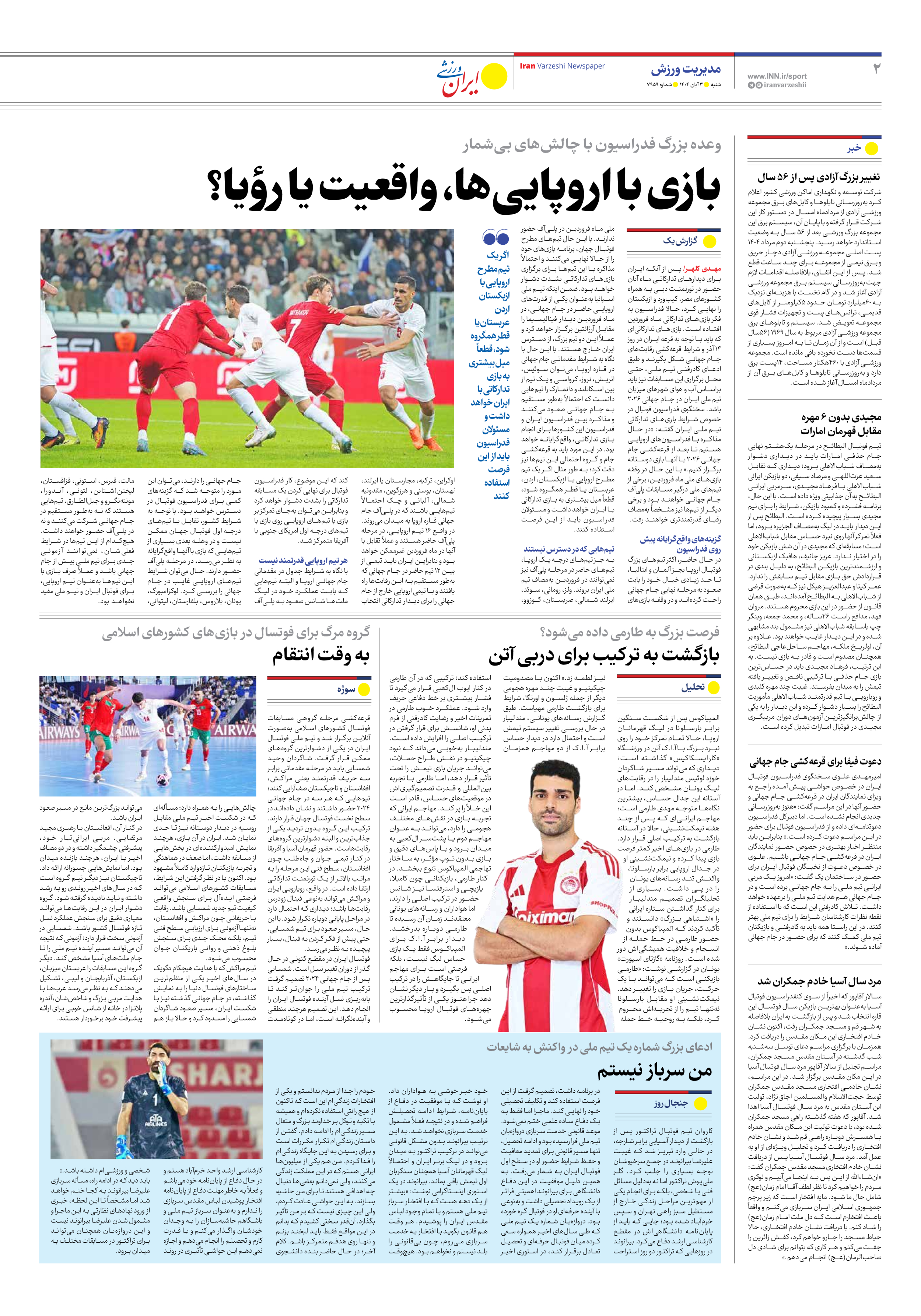 روزنامه ایران ورزشی - شماره هفت هزار و نهصد و پنجاه و نه - ۰۳ آبان ۱۴۰۴ - صفحه ۲