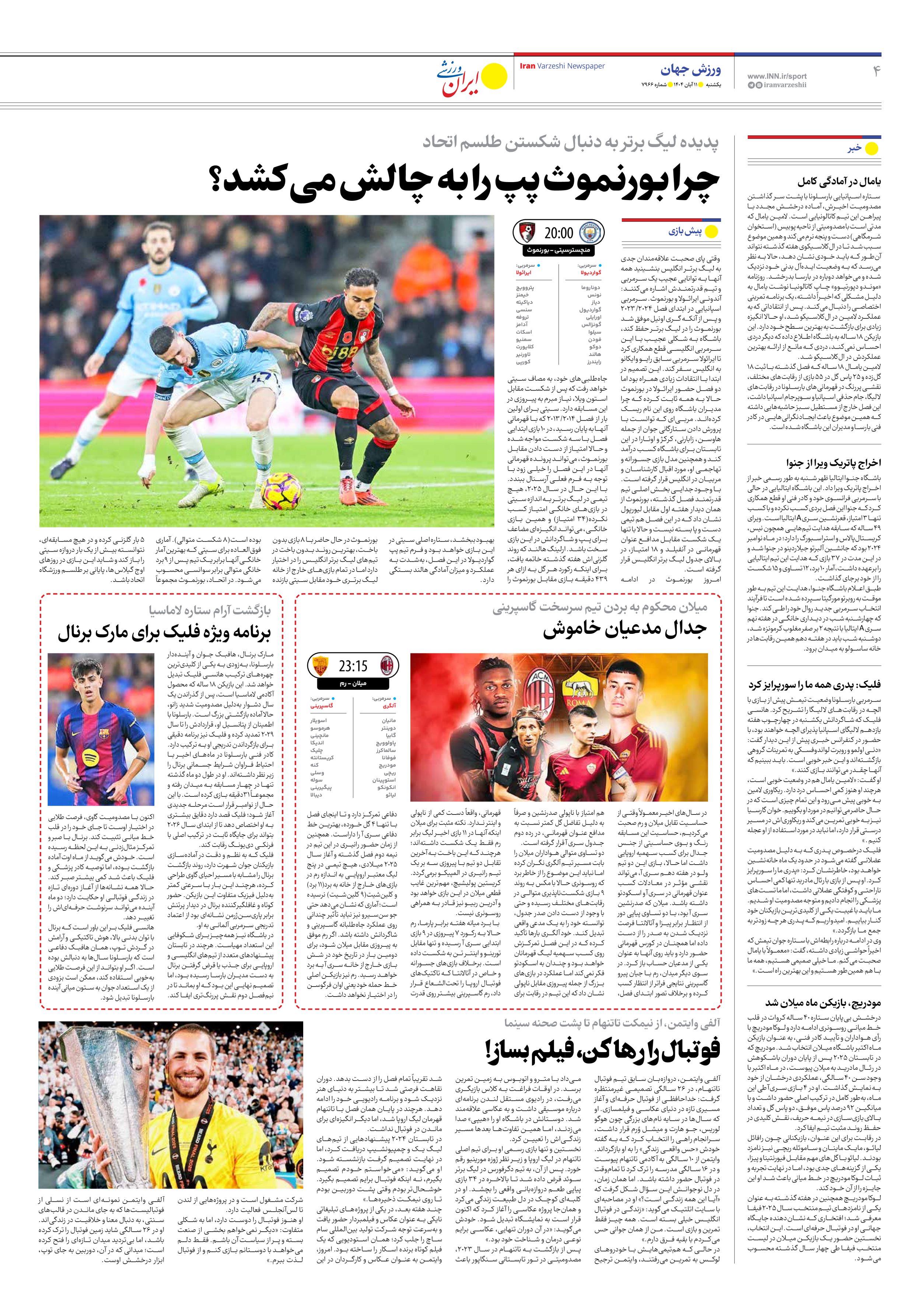 روزنامه ایران ورزشی - شماره هفت هزار و نهصد و شصت و شش - ۱۱ آبان ۱۴۰۴ - صفحه ۴