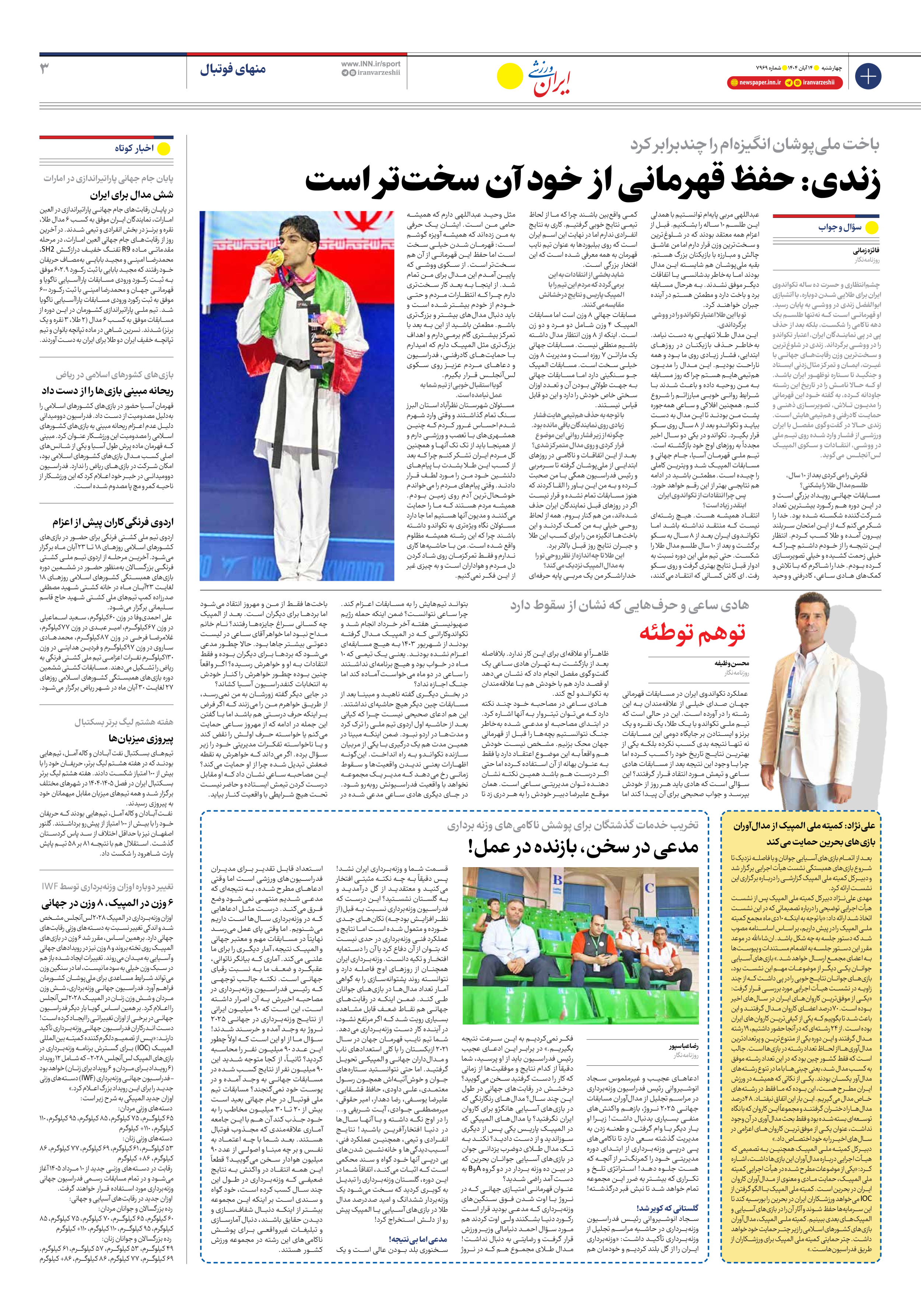 روزنامه ایران ورزشی - شماره هفت هزار و نهصد و شصت و نه - ۱۴ آبان ۱۴۰۴ - صفحه ۳