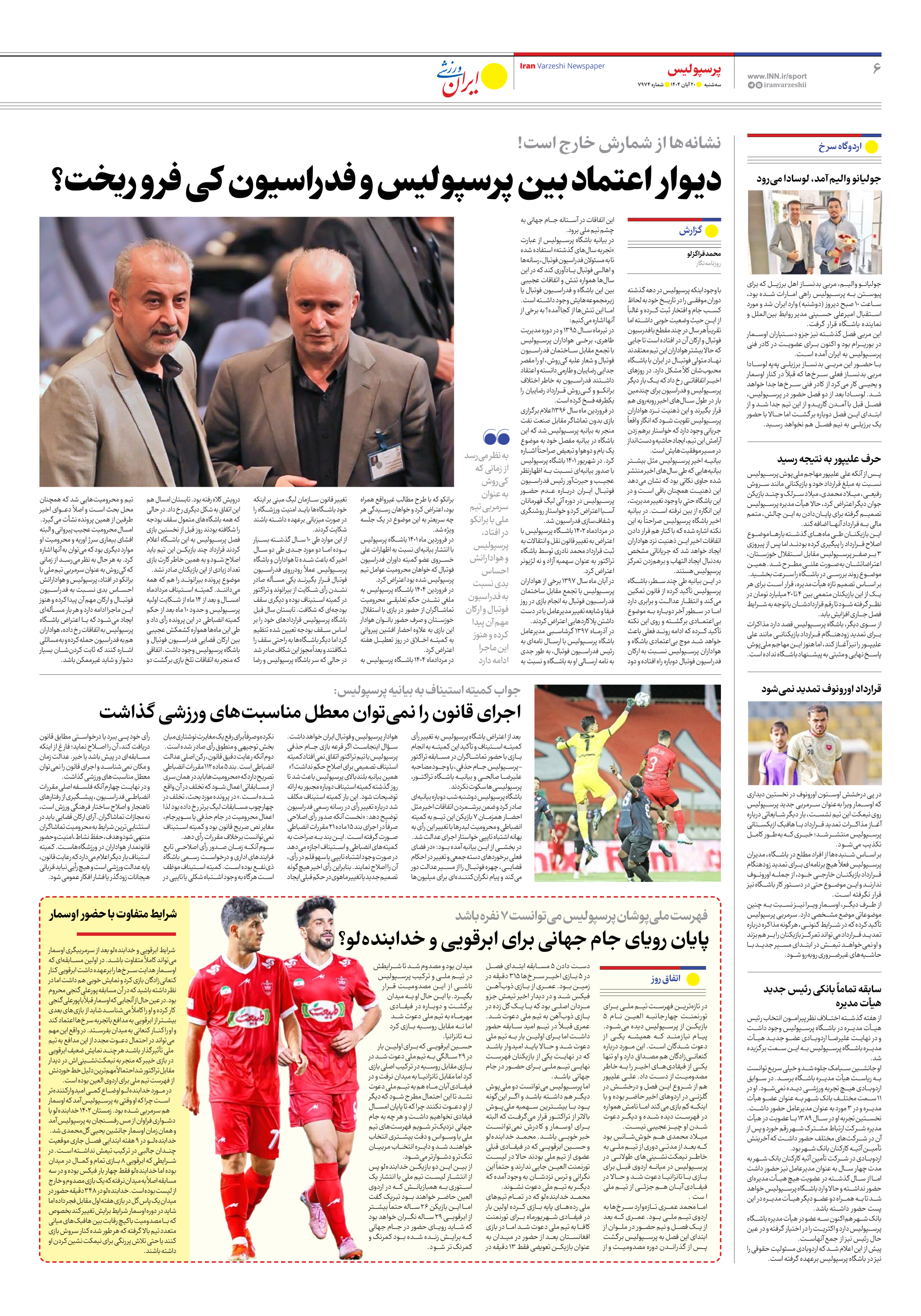 روزنامه ایران ورزشی - شماره هفت هزار و نهصد و هفتاد و چهار - ۲۰ آبان ۱۴۰۴ - صفحه ۶