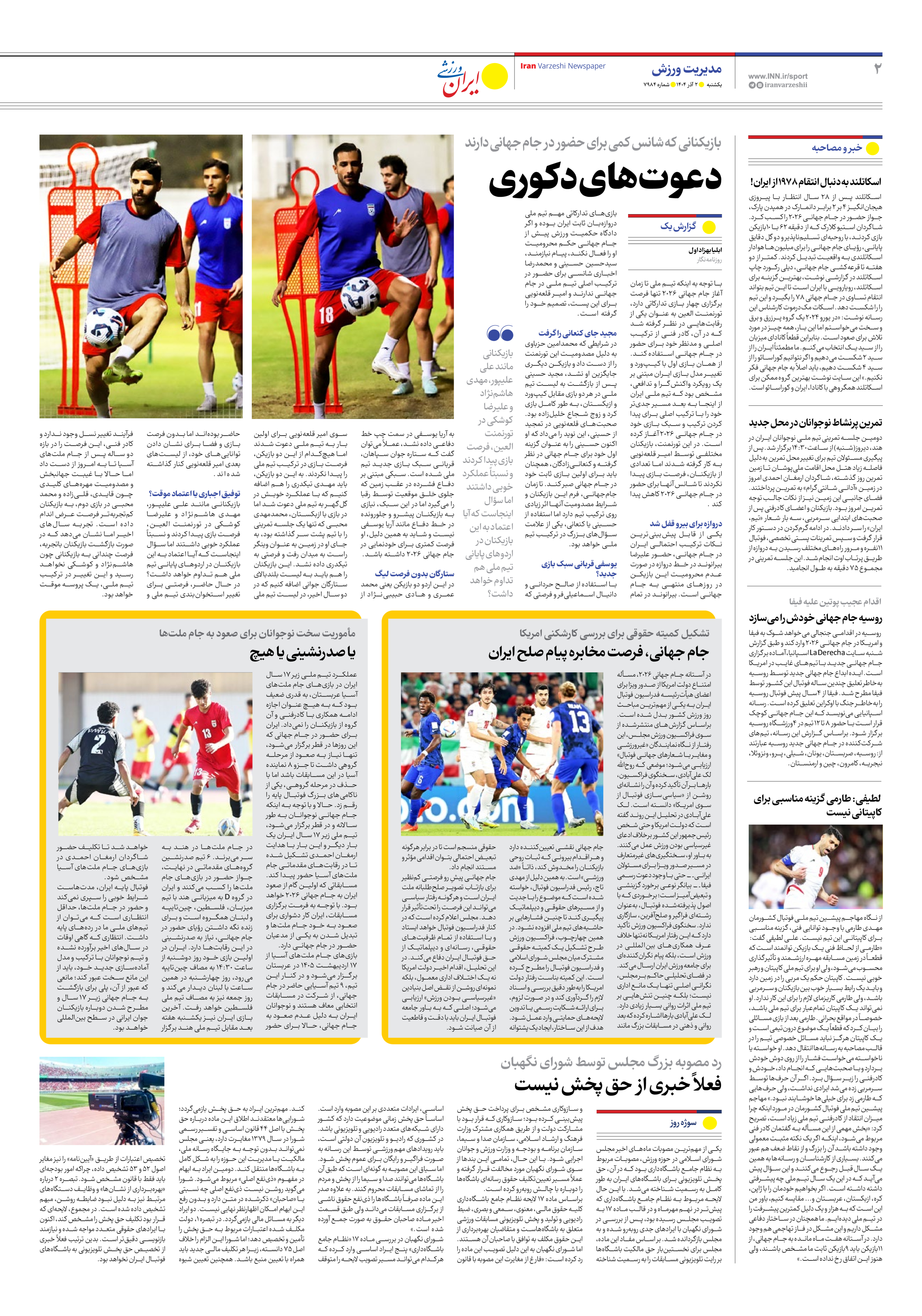 روزنامه ایران ورزشی - شماره هفت هزار و نهصد و هشتاد و چهار - ۰۲ آذر ۱۴۰۴ - صفحه ۲