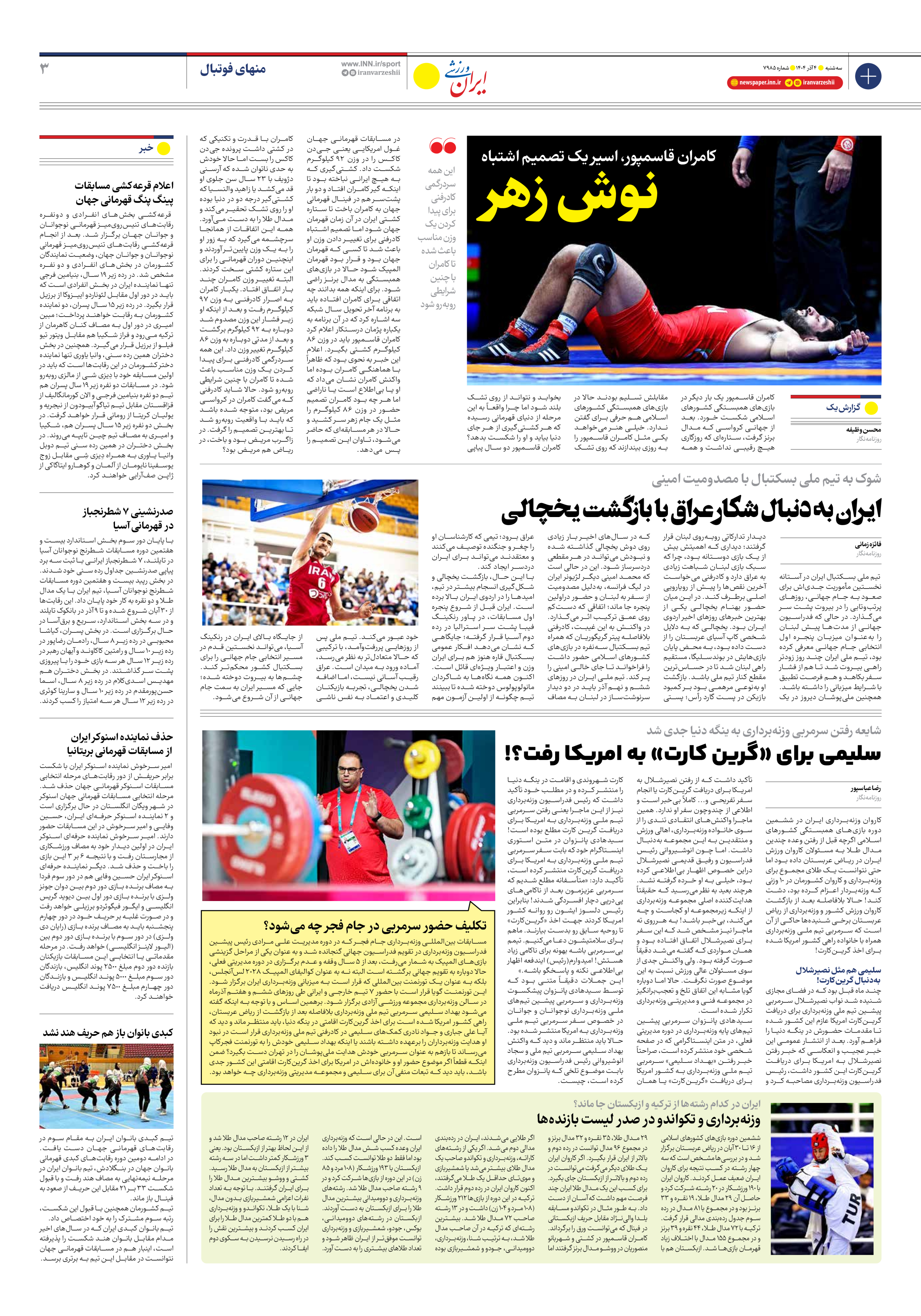 روزنامه ایران ورزشی - شماره هفت هزار و نهصد و هشتاد و پنج - ۰۴ آذر ۱۴۰۴ - صفحه ۳