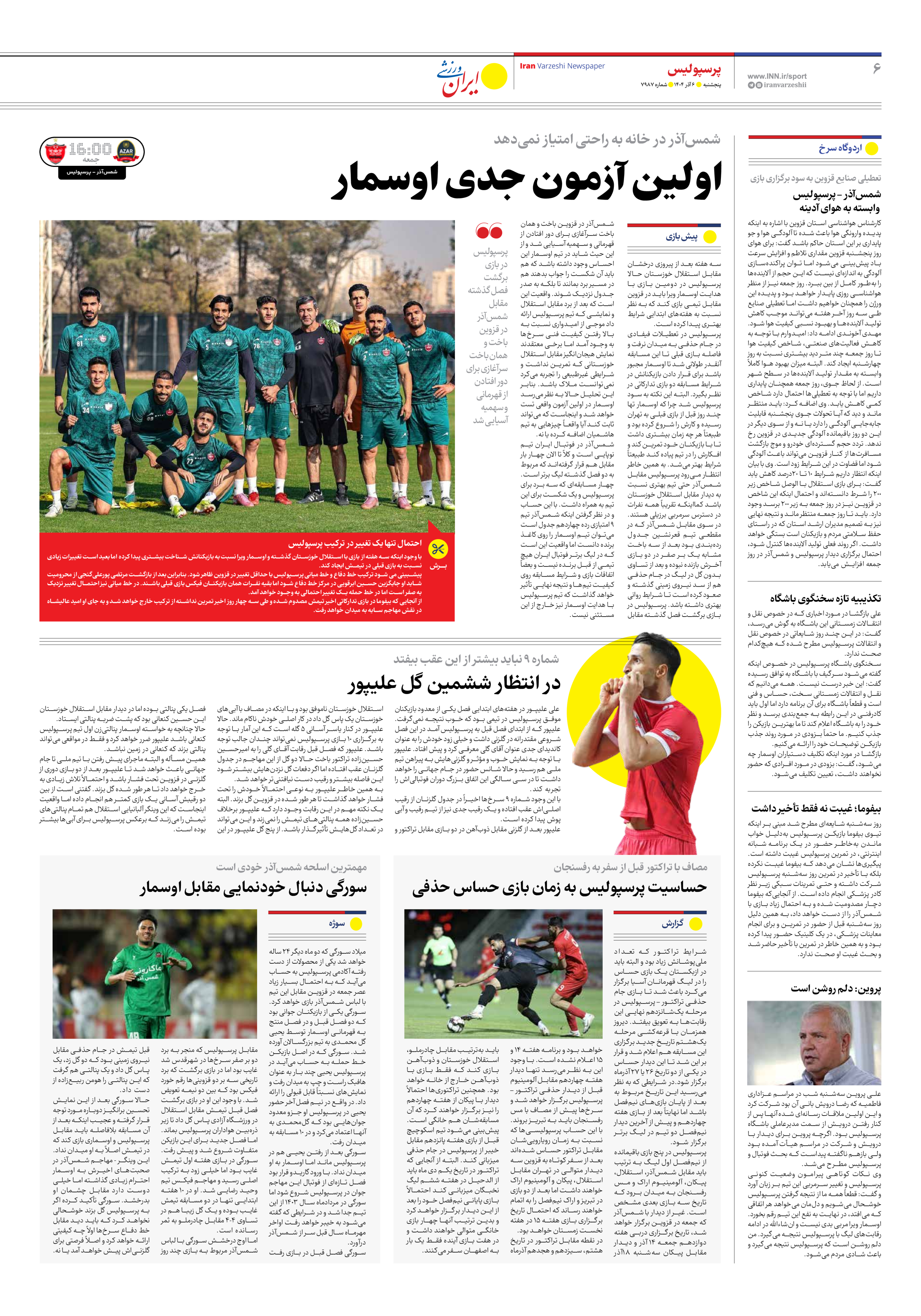 روزنامه ایران ورزشی - شماره هفت هزار و نهصد و هشتاد و هفت - ۰۶ آذر ۱۴۰۴ - صفحه ۶