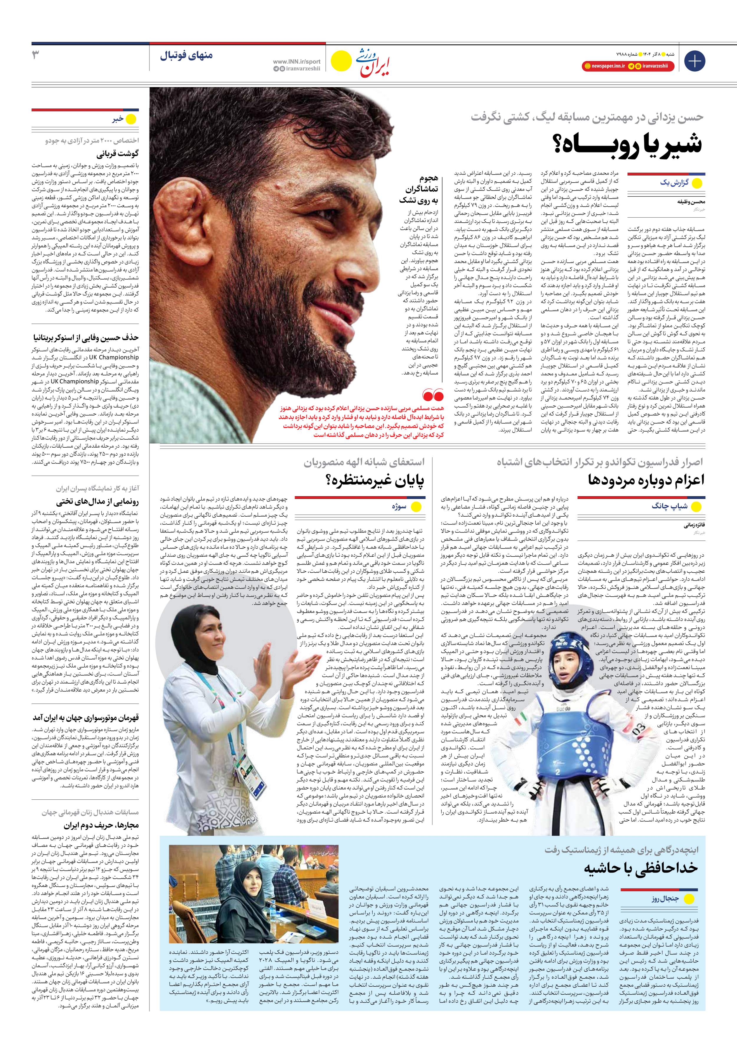 روزنامه ایران ورزشی - شماره هفت هزار و نهصد و هشتاد و هشت - ۰۸ آذر ۱۴۰۴ - صفحه ۳