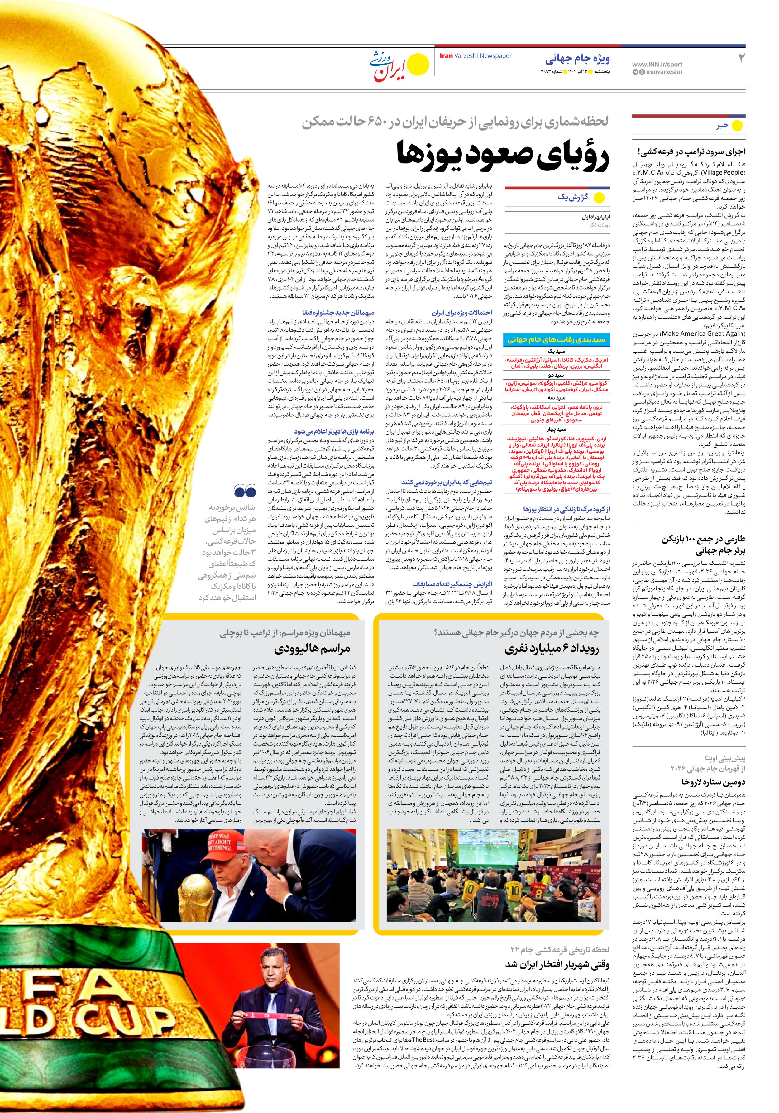 روزنامه ایران ورزشی - شماره هفت هزار و نهصد و نود و سه - ۱۳ آذر ۱۴۰۴ - صفحه ۲