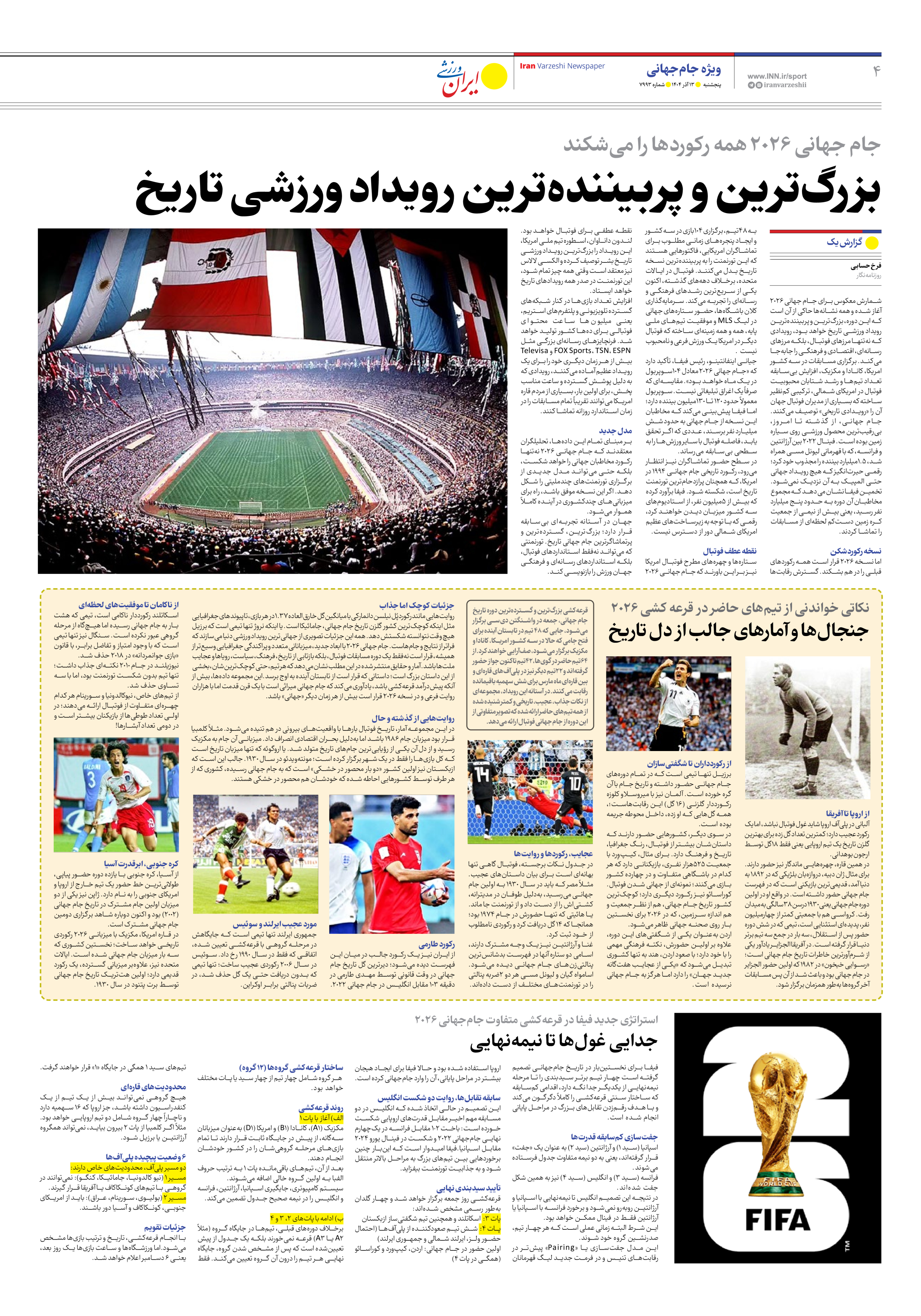 روزنامه ایران ورزشی - شماره هفت هزار و نهصد و نود و سه - ۱۳ آذر ۱۴۰۴ - صفحه ۴