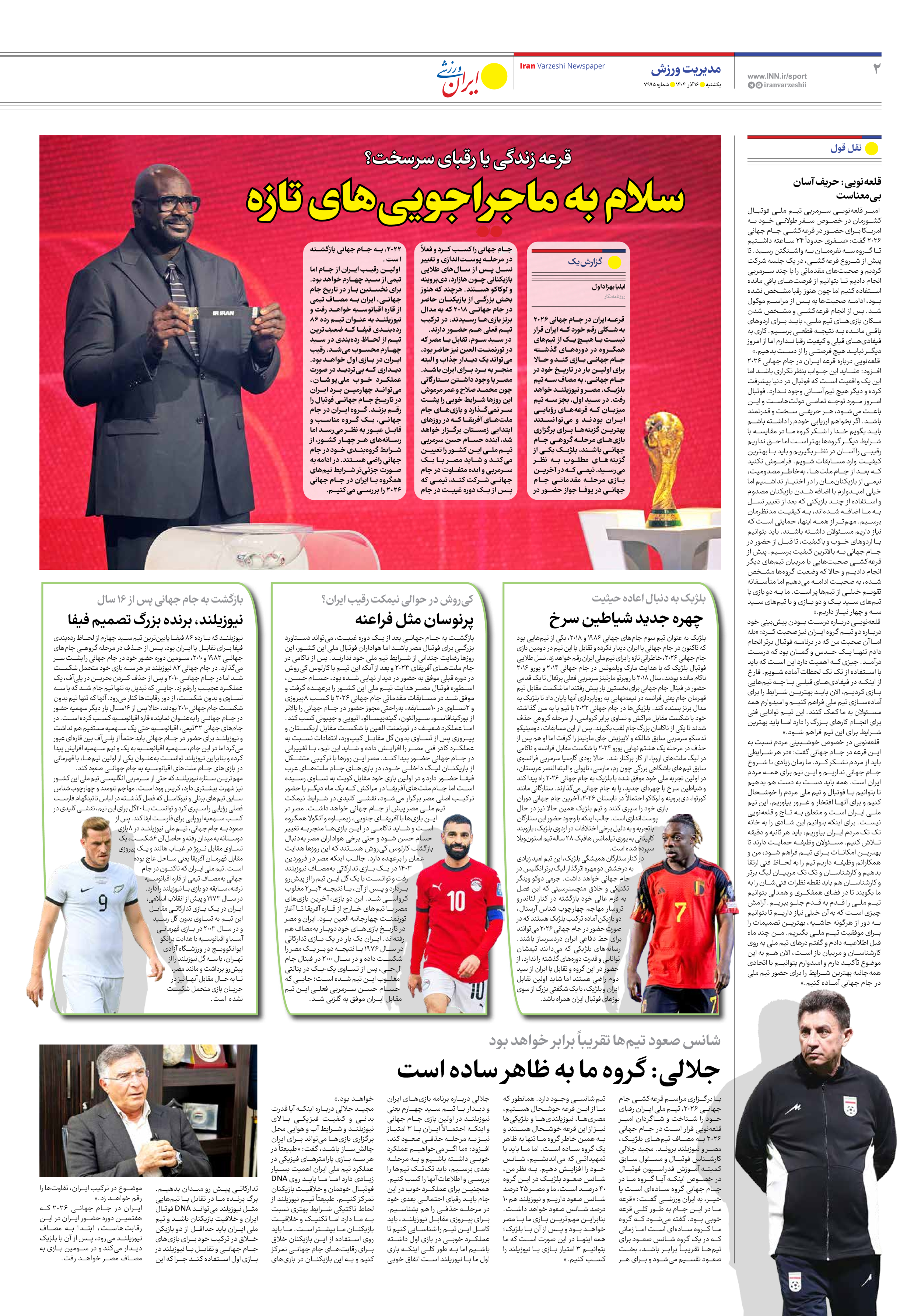 روزنامه ایران ورزشی - شماره هفت هزار و نهصد و نود و پنج - ۱۶ آذر ۱۴۰۴ - صفحه ۲