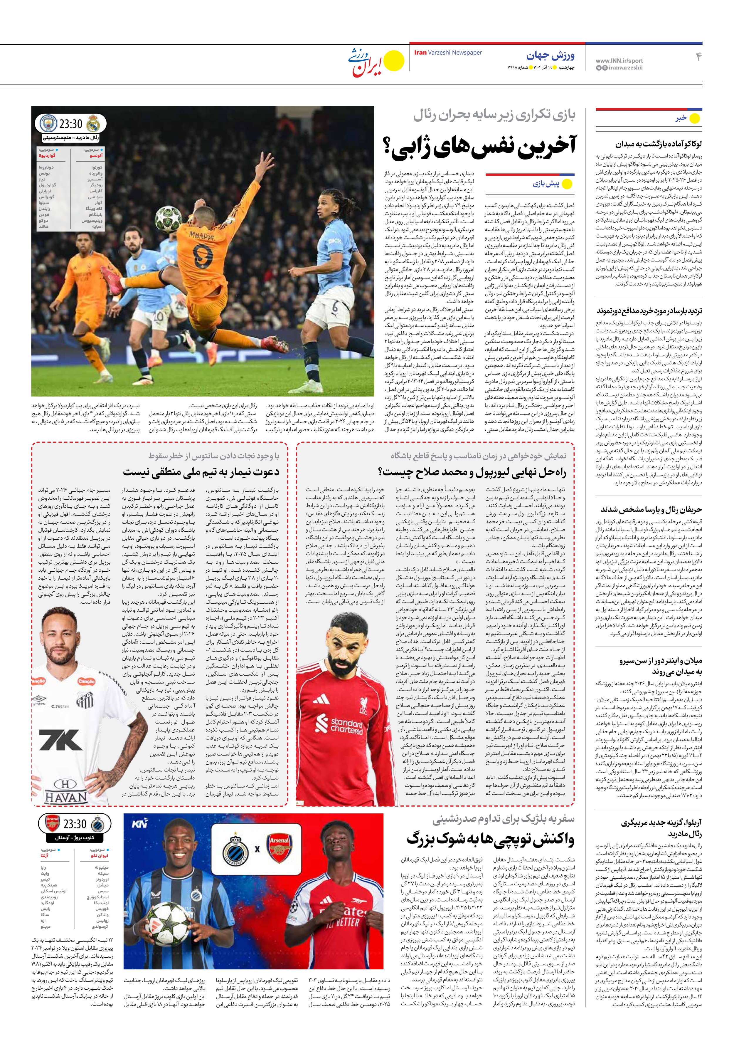 روزنامه ایران ورزشی - شماره هفت هزار و نهصد و نود و هشت - ۱۹ آذر ۱۴۰۴ - صفحه ۴
