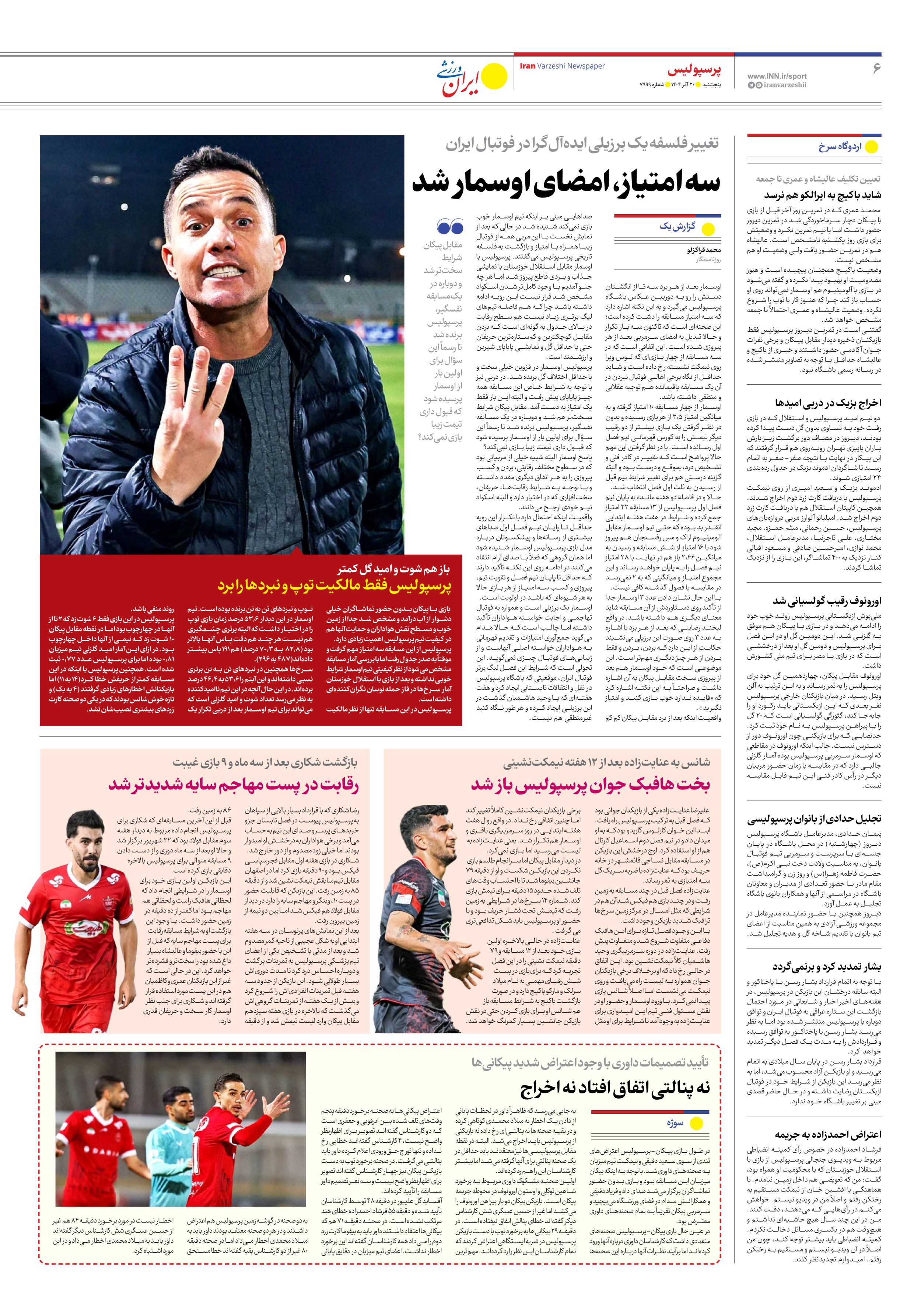 روزنامه ایران ورزشی - شماره هفت هزار و نهصد و نود و نه - ۲۰ آذر ۱۴۰۴ - صفحه ۶
