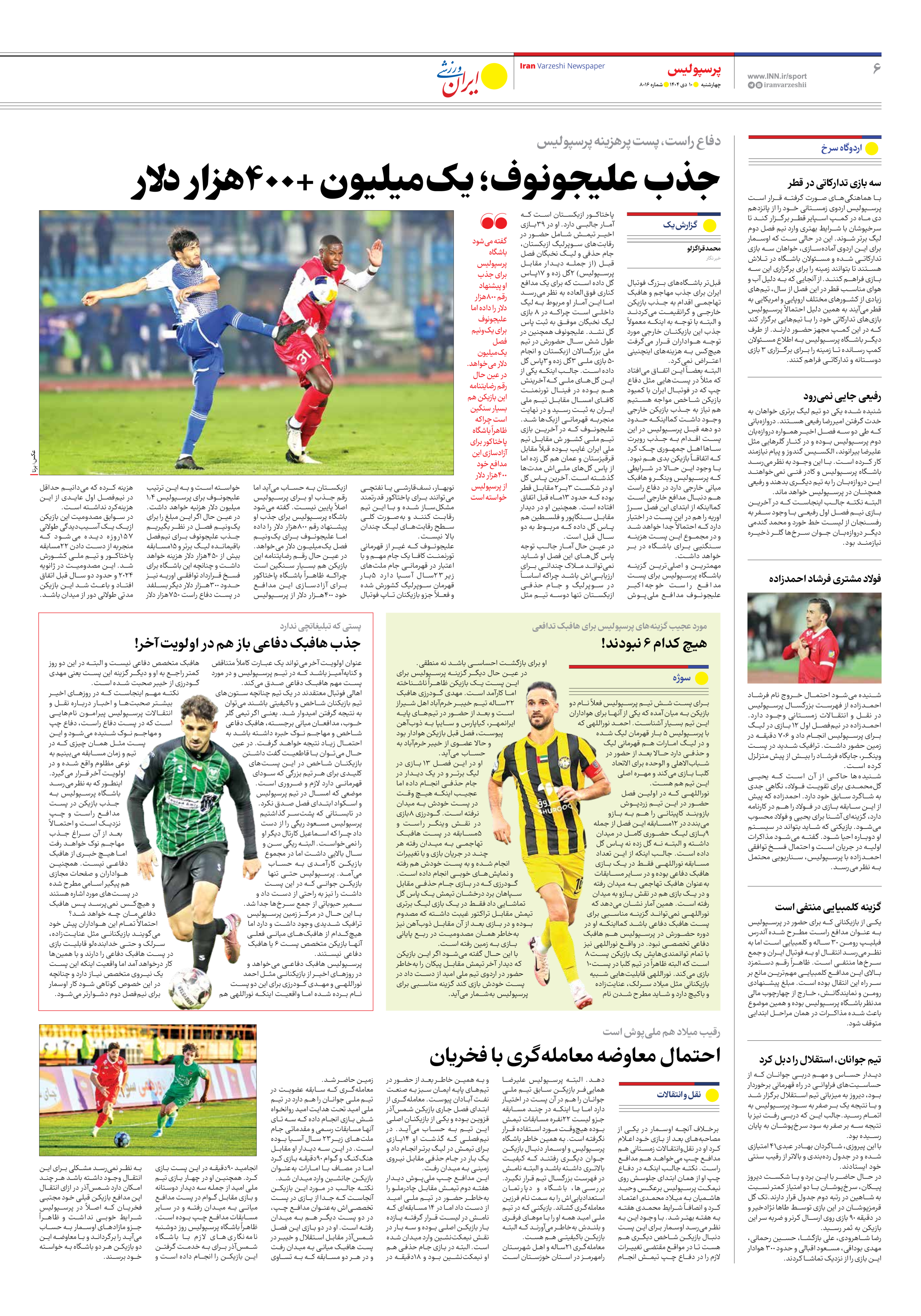 روزنامه ایران ورزشی - شماره هشت هزار و شانزده - ۱۰ دی ۱۴۰۴ - صفحه ۶