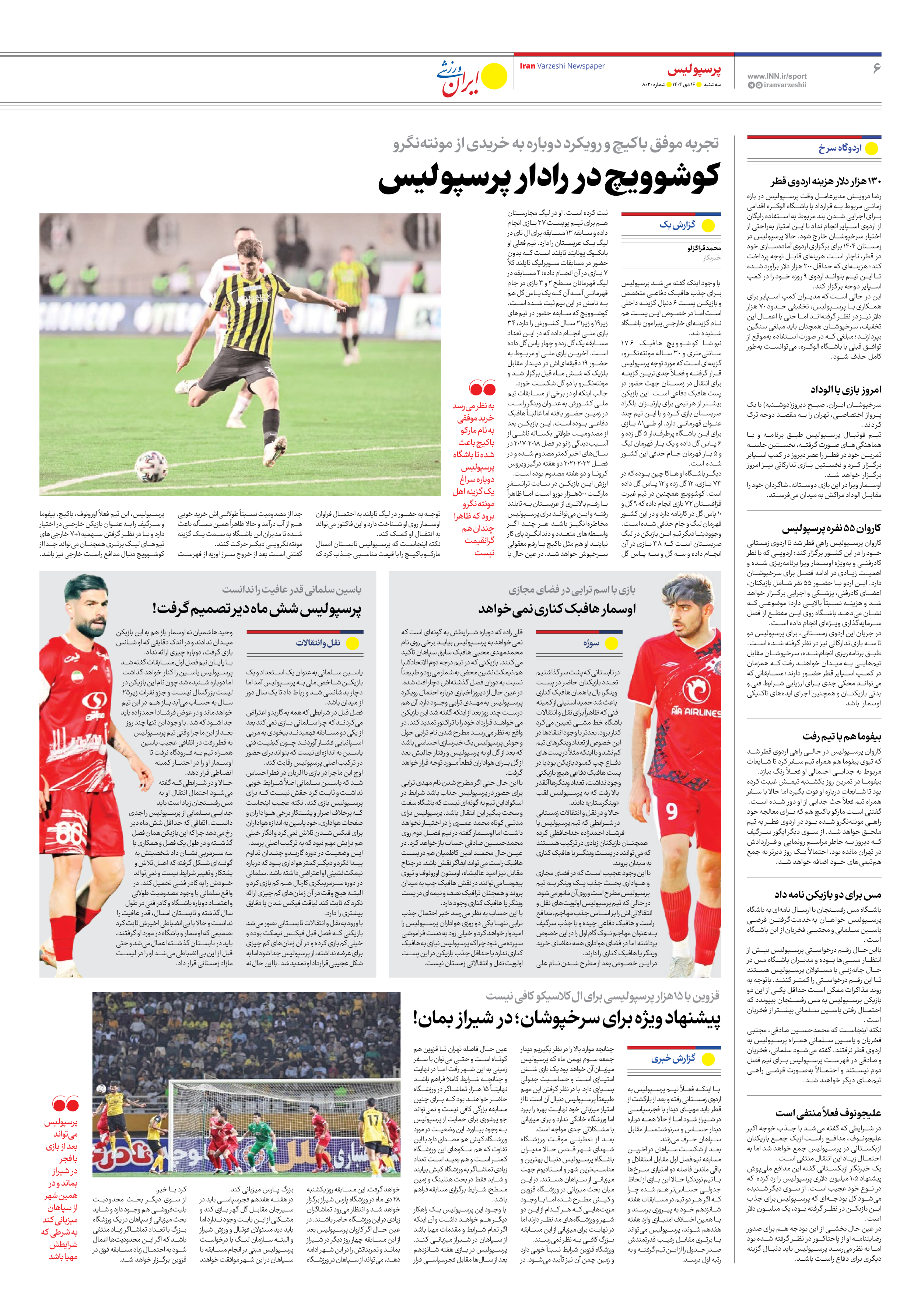 روزنامه ایران ورزشی - شماره هشت هزار و بیست - ۱۶ دی ۱۴۰۴ - صفحه ۶