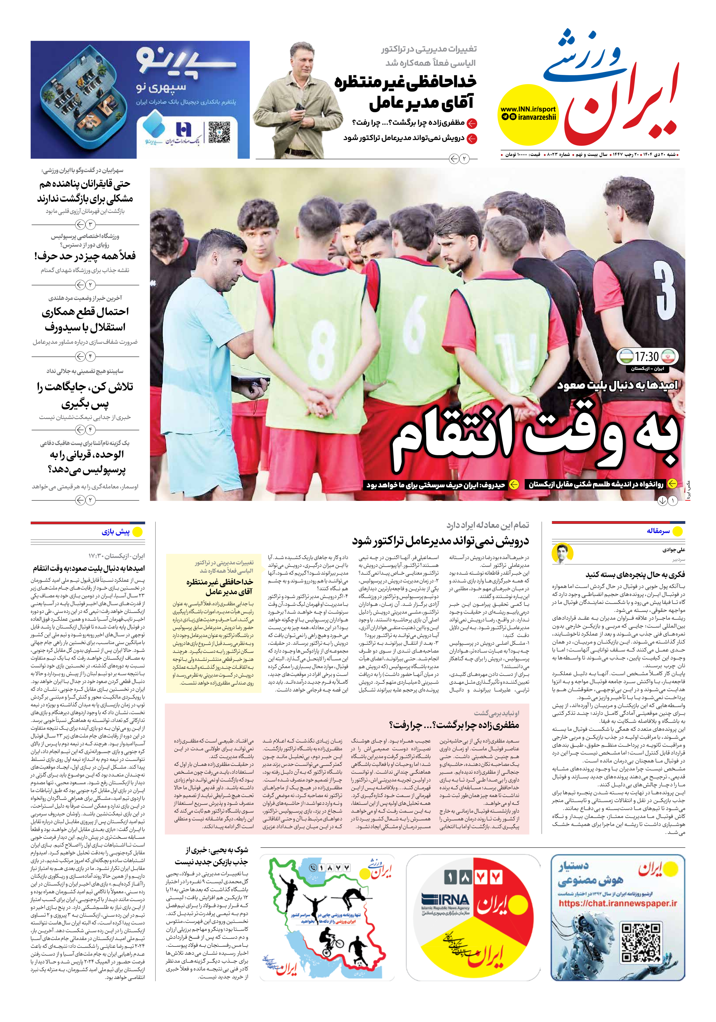 روزنامه ایران ورزشی - شماره هشت هزار و بیست و سه - ۲۰ دی ۱۴۰۴