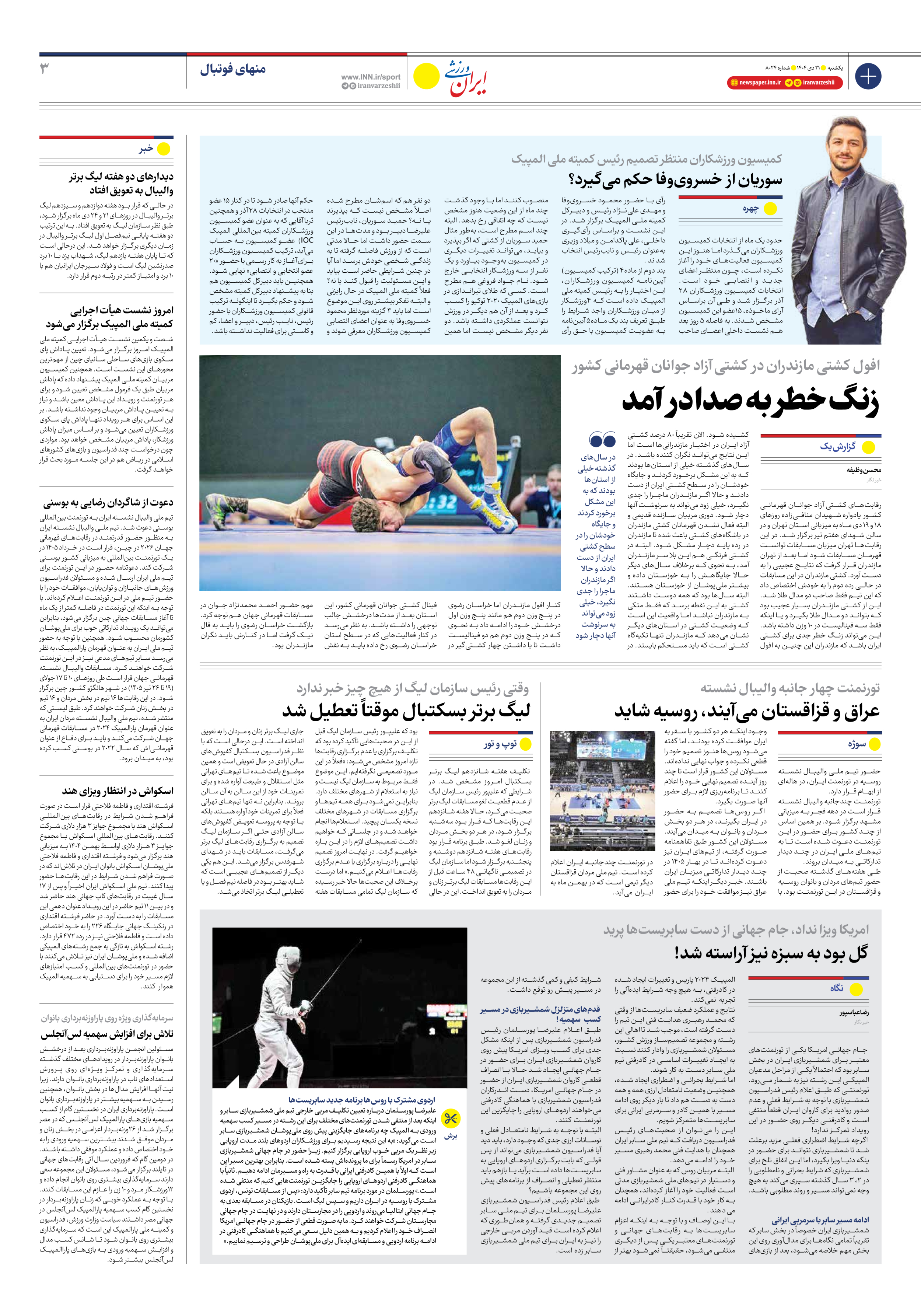 روزنامه ایران ورزشی - شماره هشت هزار و بیست و چهار - ۲۱ دی ۱۴۰۴ - صفحه ۳