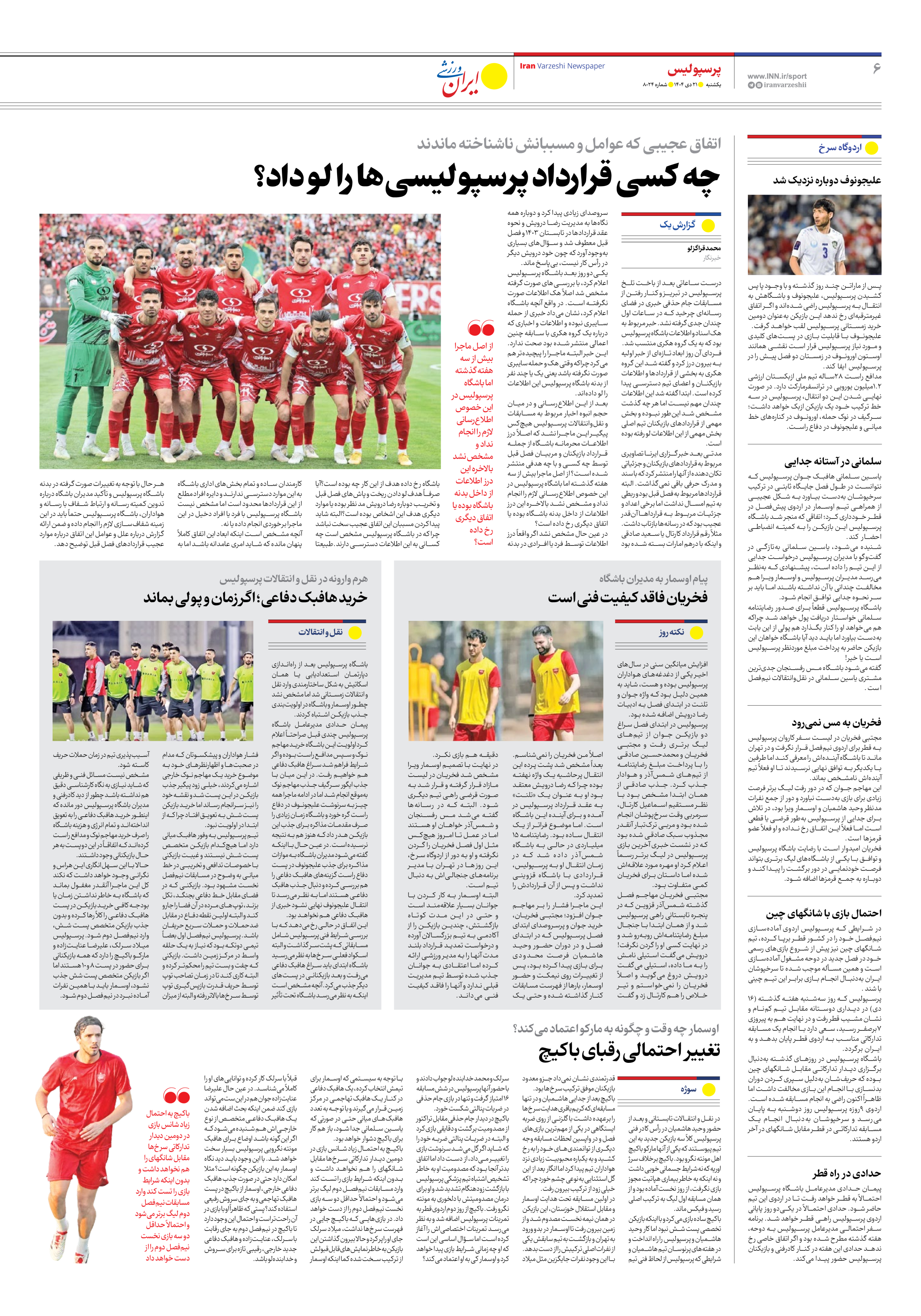 روزنامه ایران ورزشی - شماره هشت هزار و بیست و چهار - ۲۱ دی ۱۴۰۴ - صفحه ۶