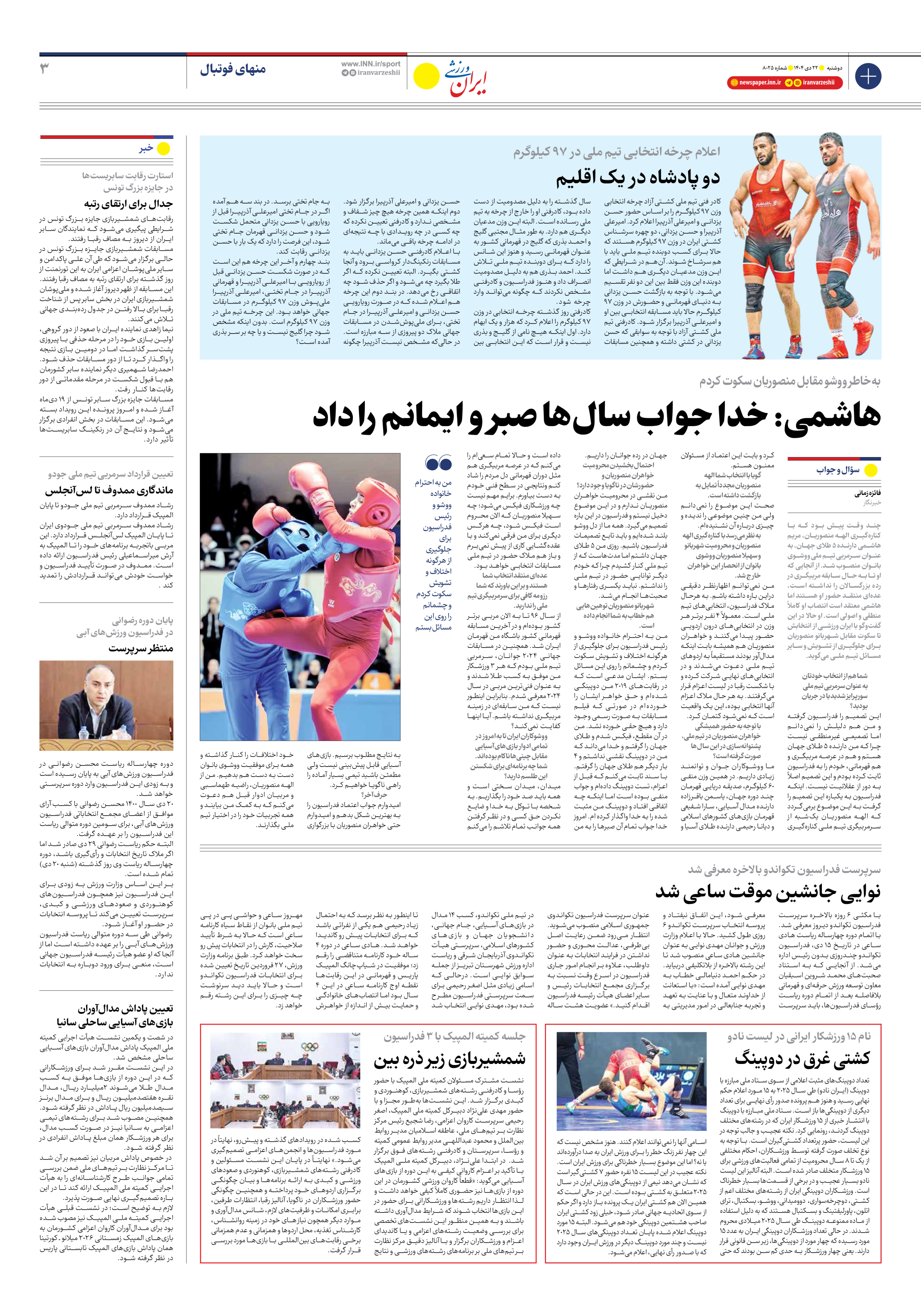 روزنامه ایران ورزشی - شماره هشت هزار و بیست و پنج - ۲۲ دی ۱۴۰۴ - صفحه ۳