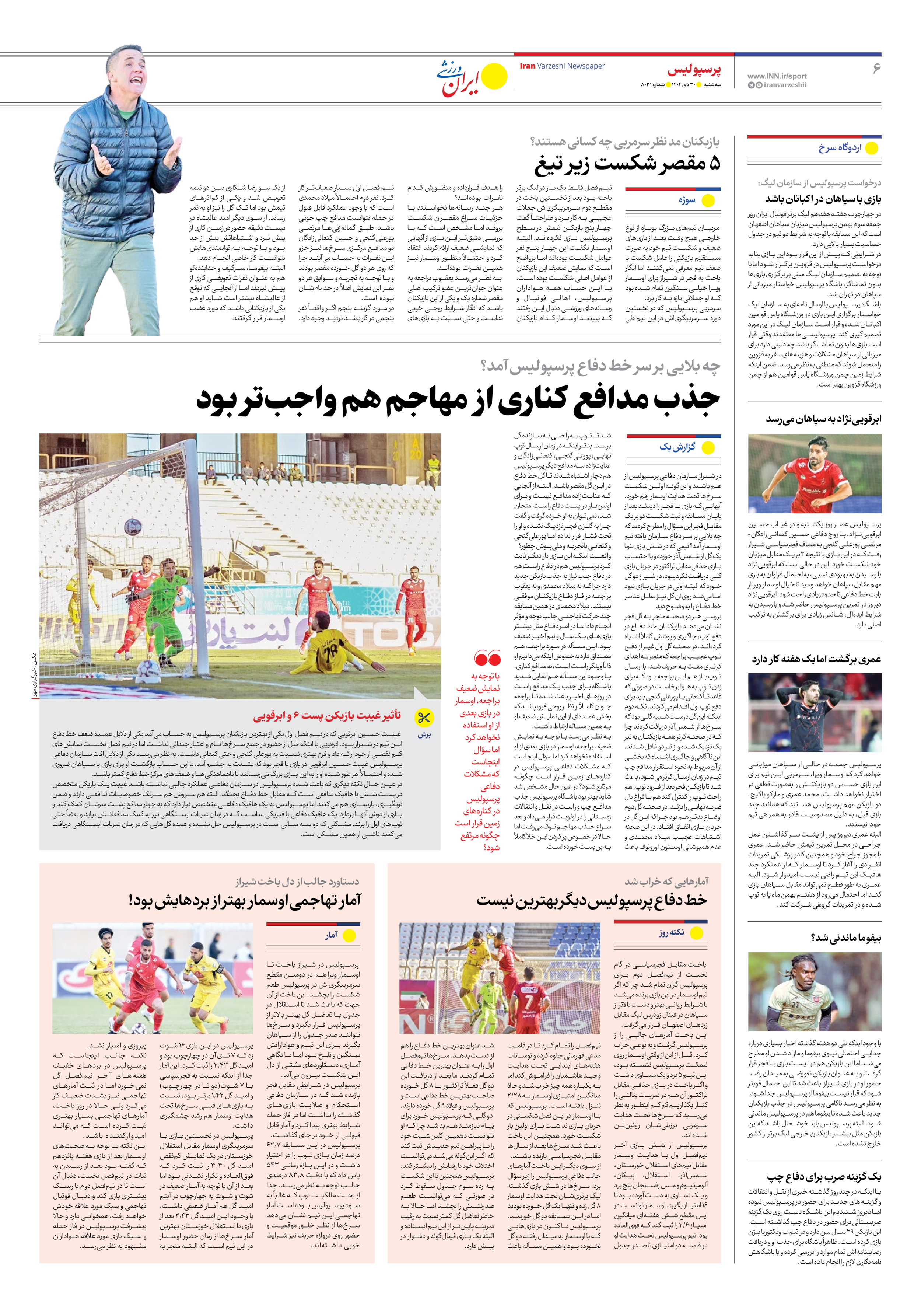 روزنامه ایران ورزشی - شماره هشت هزار و سی و یک - ۳۰ دی ۱۴۰۴ - صفحه ۶