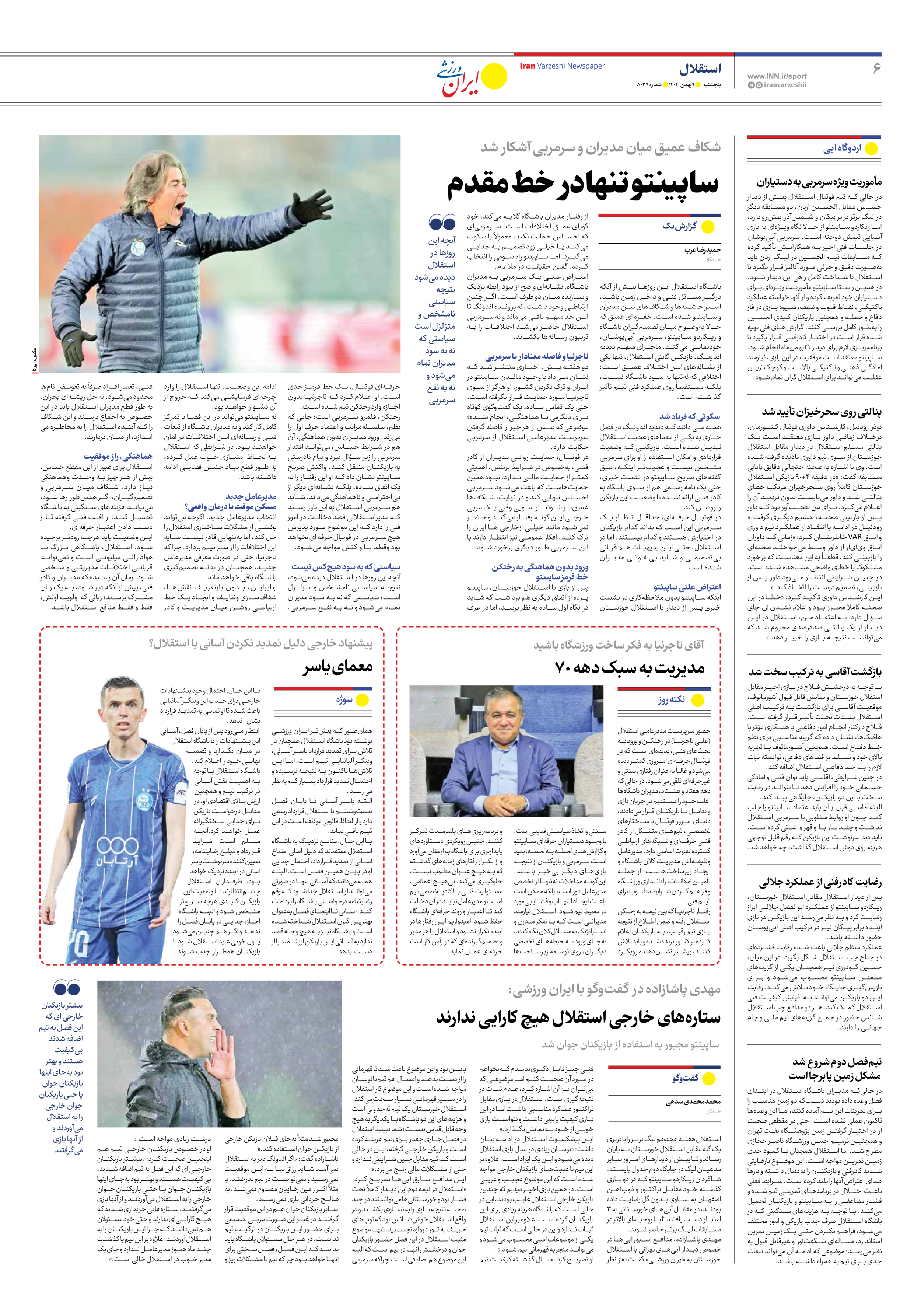 روزنامه ایران ورزشی - شماره هشت هزار و سی و نه - ۰۹ بهمن ۱۴۰۴ - صفحه ۶