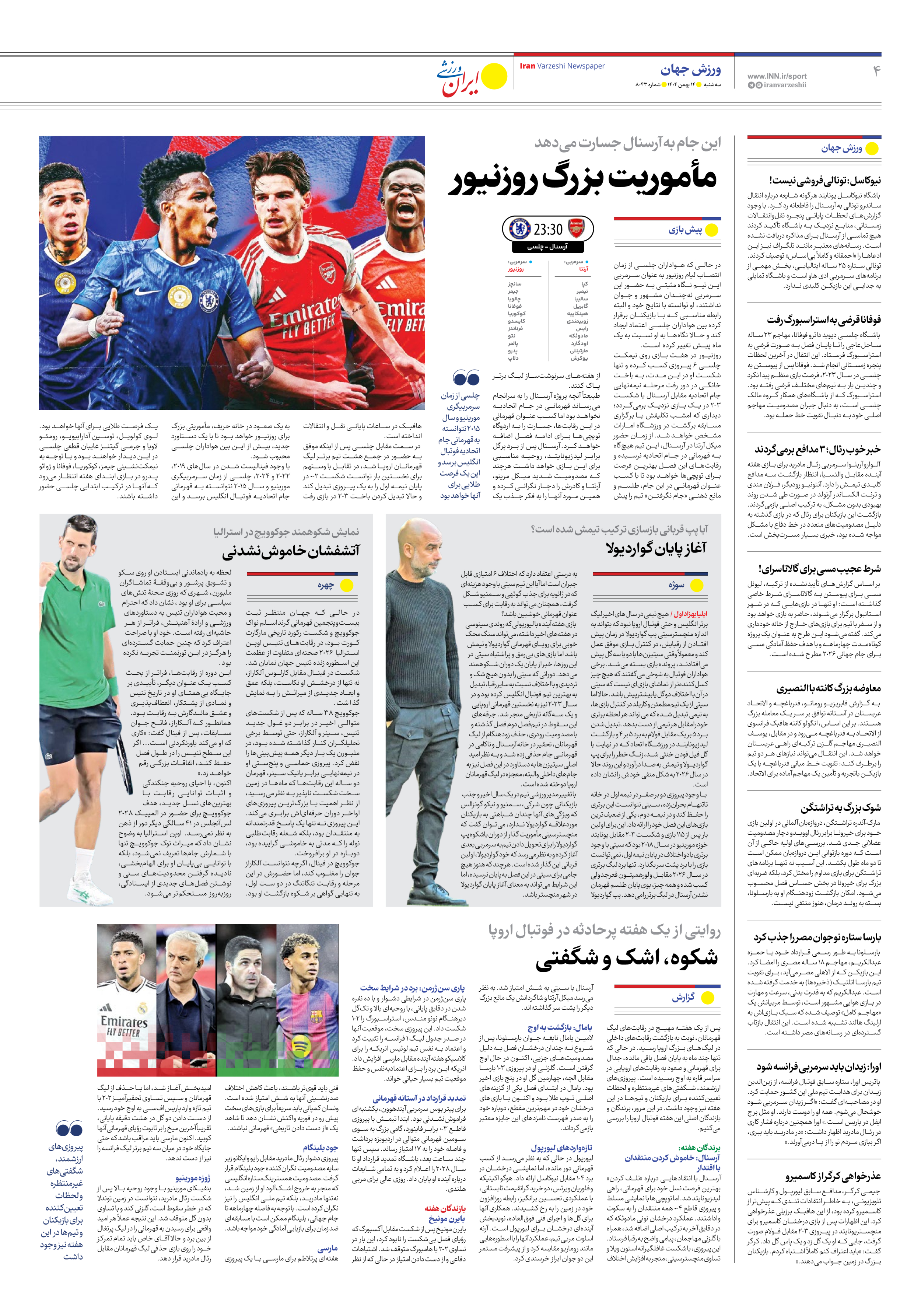 روزنامه ایران ورزشی - شماره هشت هزار و چهل و سه - ۱۴ بهمن ۱۴۰۴ - صفحه ۴