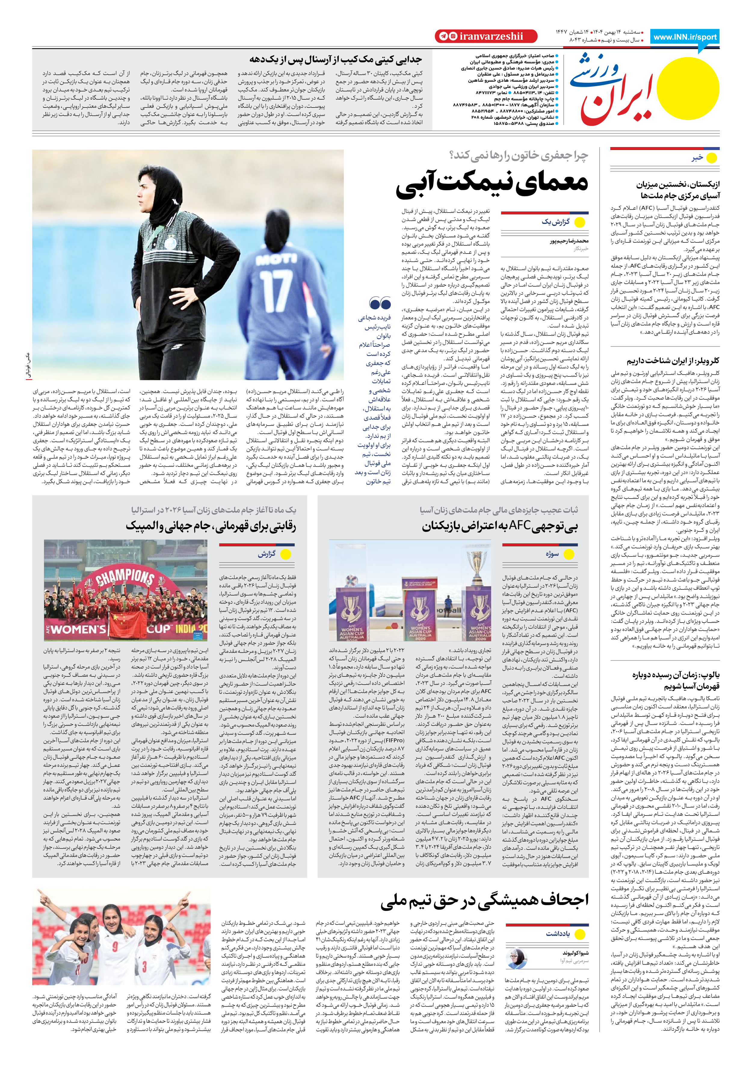 روزنامه ایران ورزشی - شماره هشت هزار و چهل و سه - ۱۴ بهمن ۱۴۰۴ - صفحه ۸