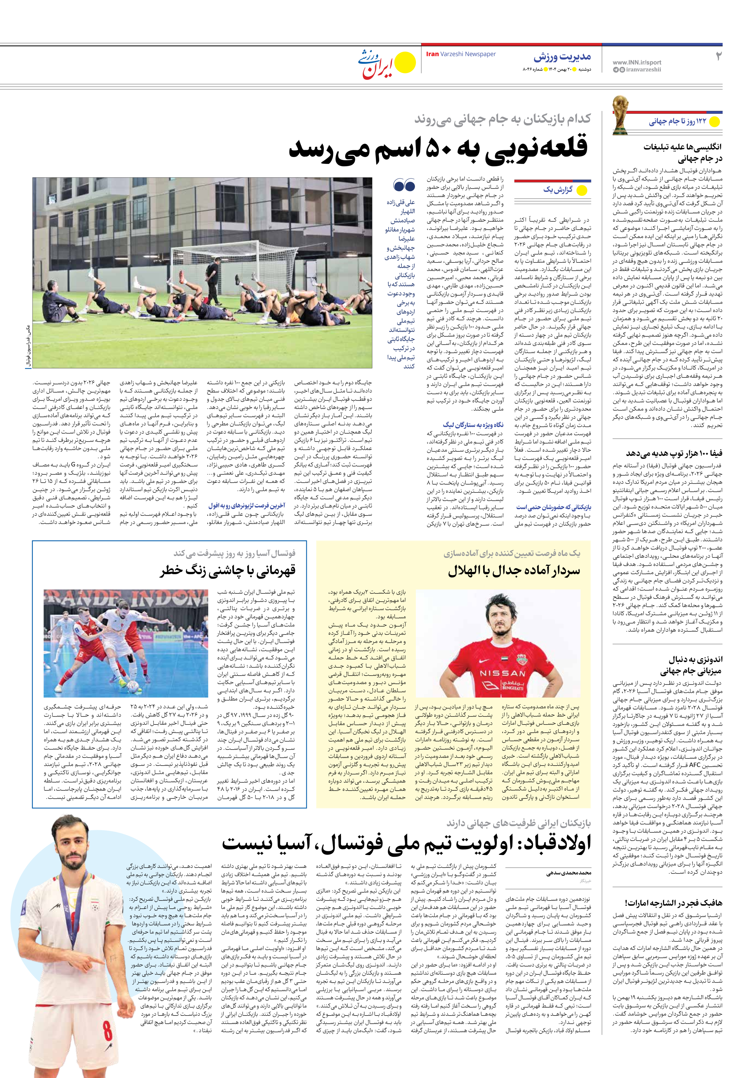 روزنامه ایران ورزشی - شماره هشت هزار و چهل و شش - ۲۰ بهمن ۱۴۰۴ - صفحه ۲