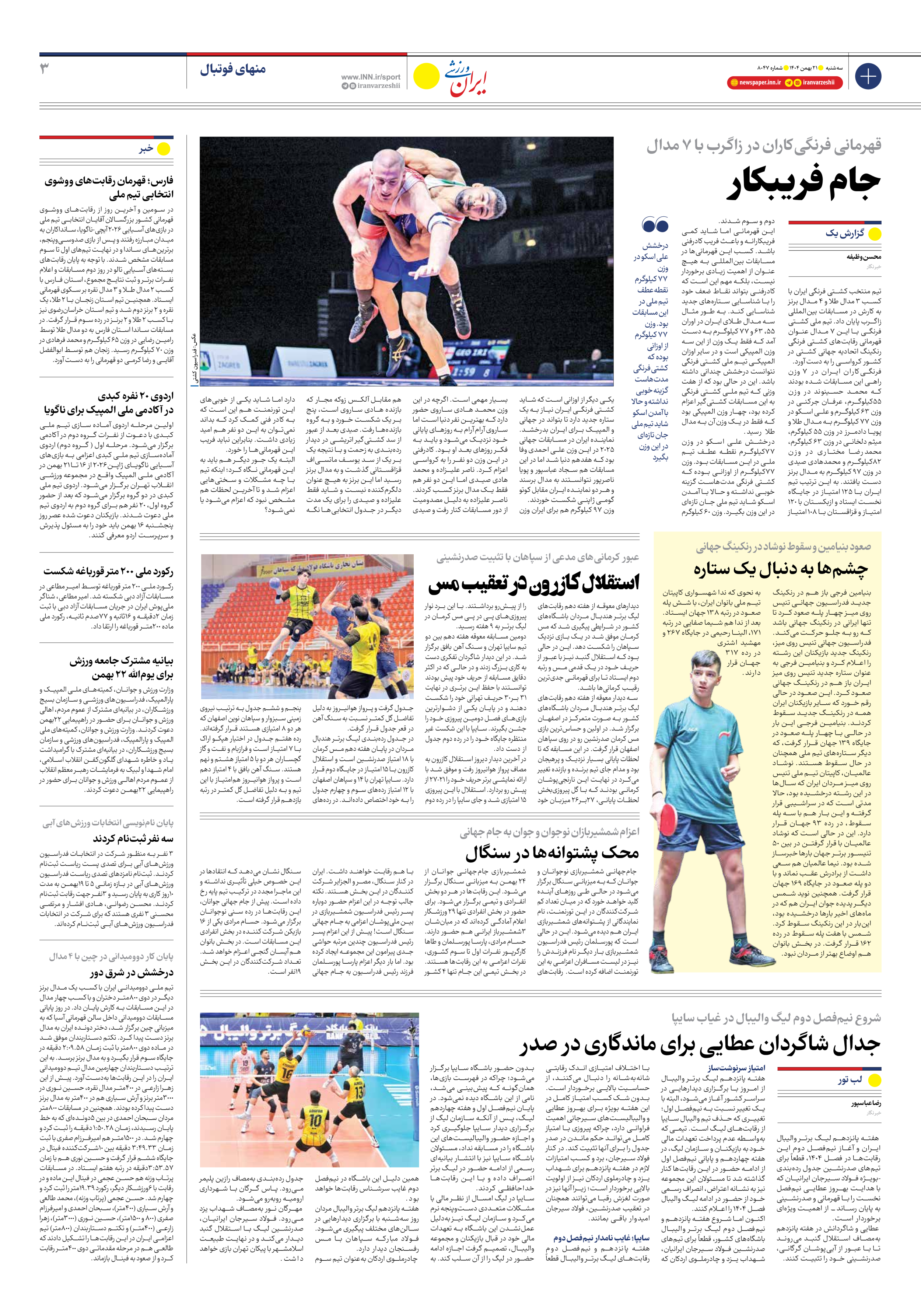 روزنامه ایران ورزشی - شماره هشت هزار و چهل و هفت - ۲۱ بهمن ۱۴۰۴ - صفحه ۳