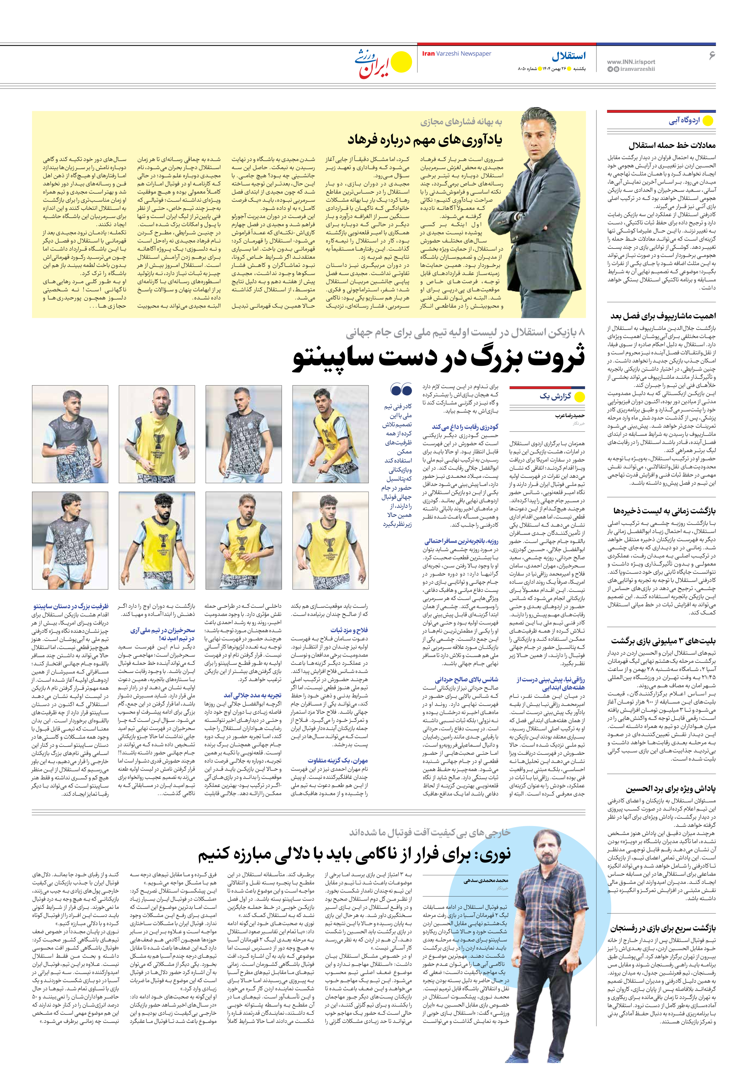 روزنامه ایران ورزشی - شماره هشت هزار و پنجاه - ۲۶ بهمن ۱۴۰۴ - صفحه ۶