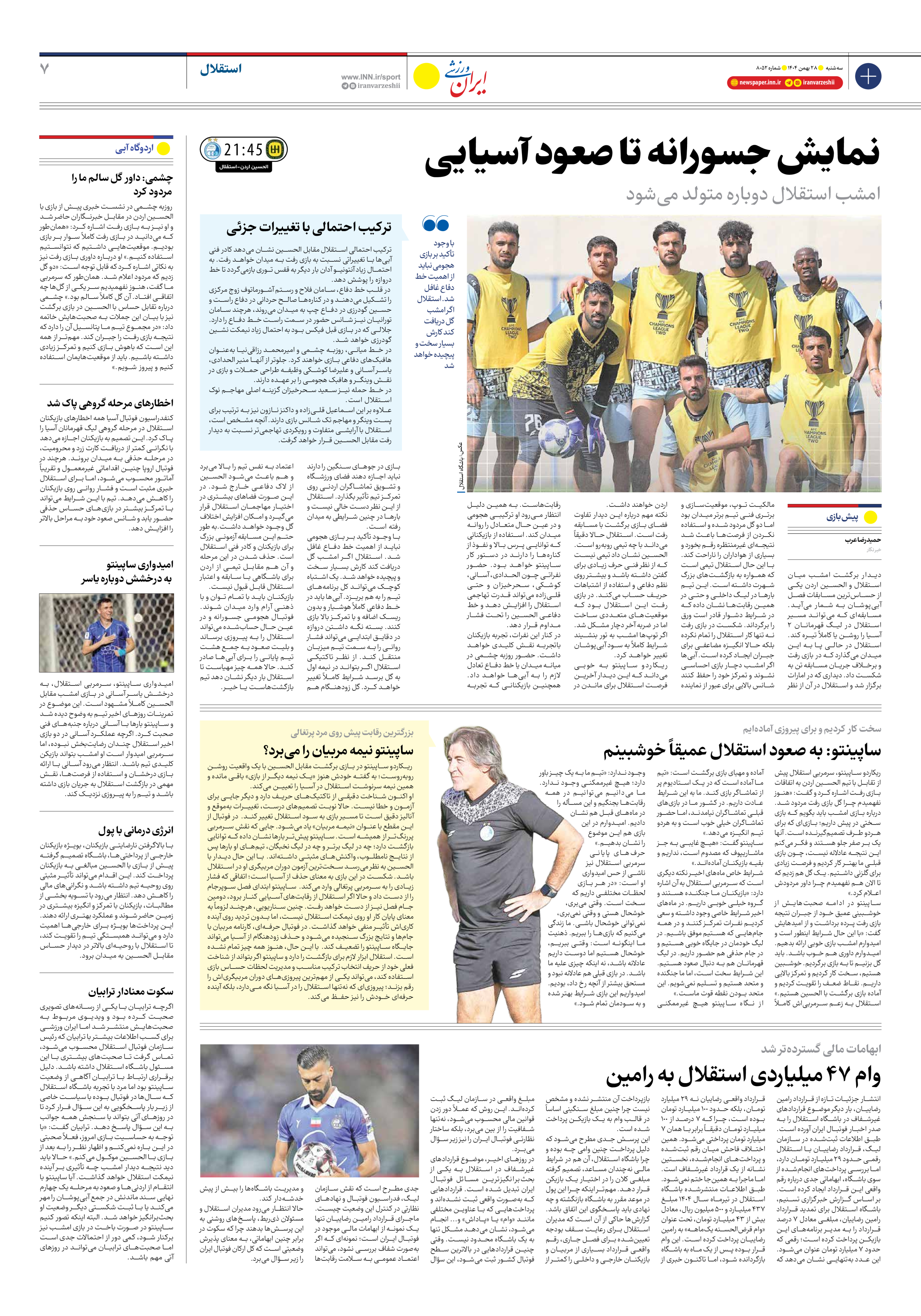روزنامه ایران ورزشی - شماره هشت هزار و پنجاه و دو - ۲۸ بهمن ۱۴۰۴ - صفحه ۷