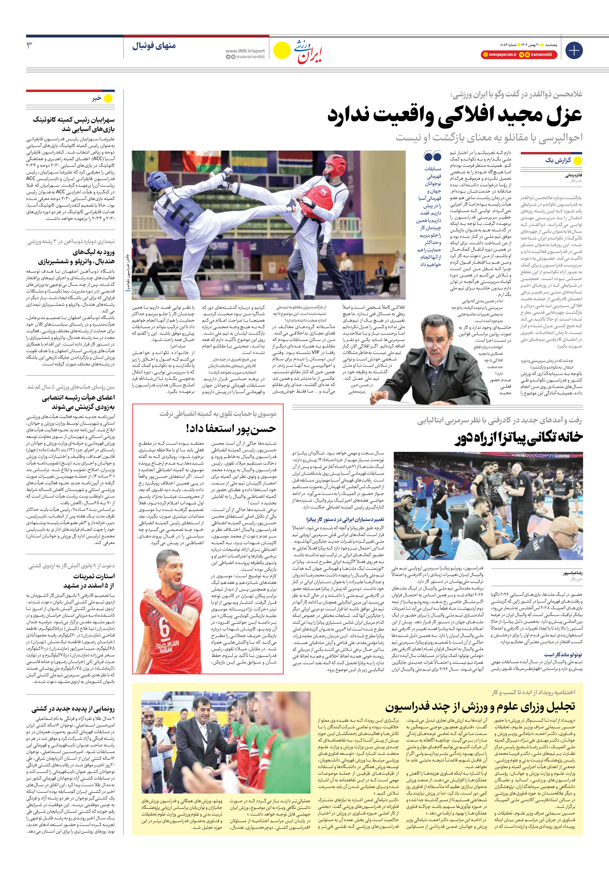 روزنامه ایران ورزشی - شماره هشت هزار و پنجاه و چهار - ۳۰ بهمن ۱۴۰۴ - صفحه ۳