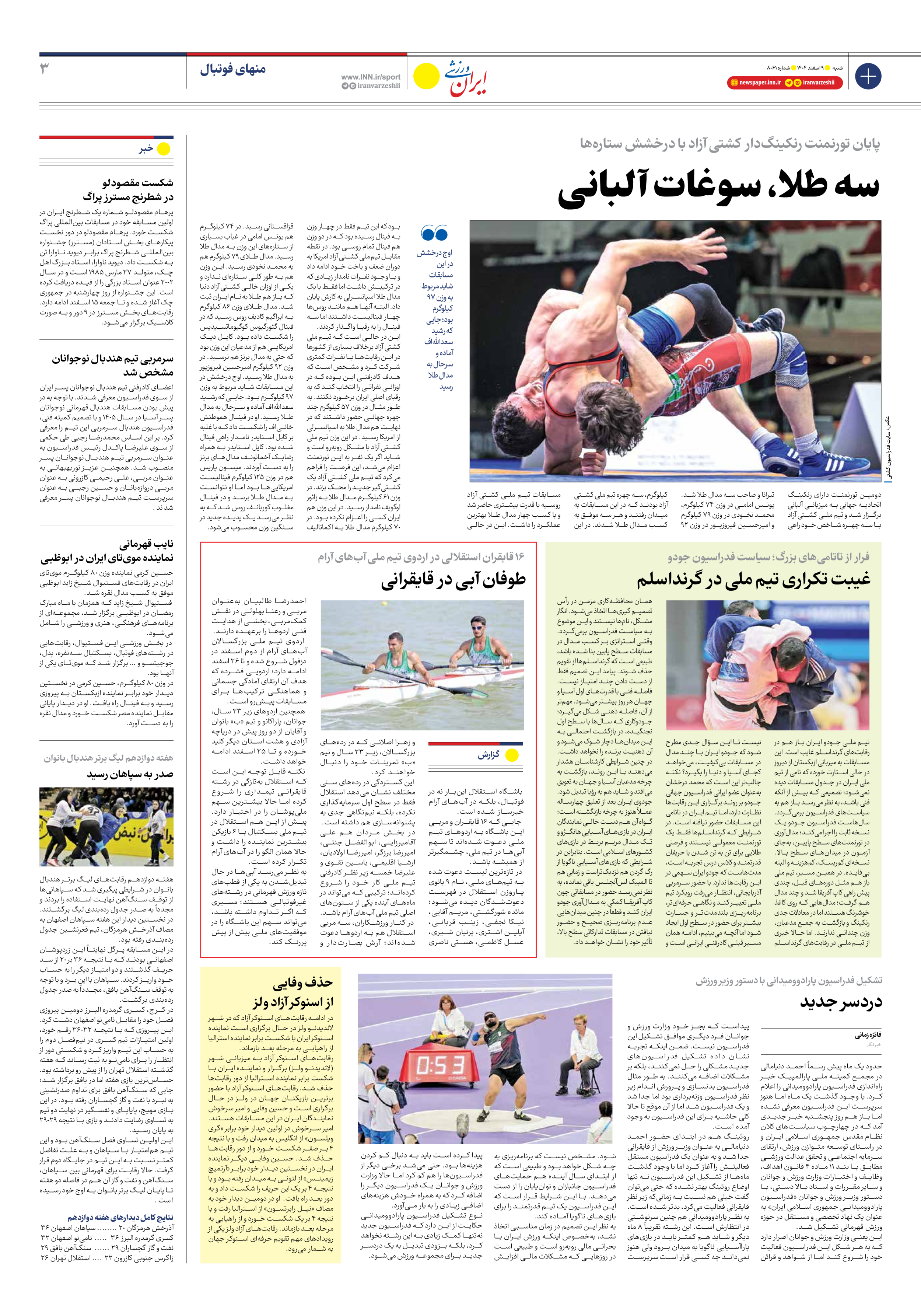 روزنامه ایران ورزشی - شماره هشت هزار و شصت و یک - ۰۹ اسفند ۱۴۰۴ - صفحه ۳
