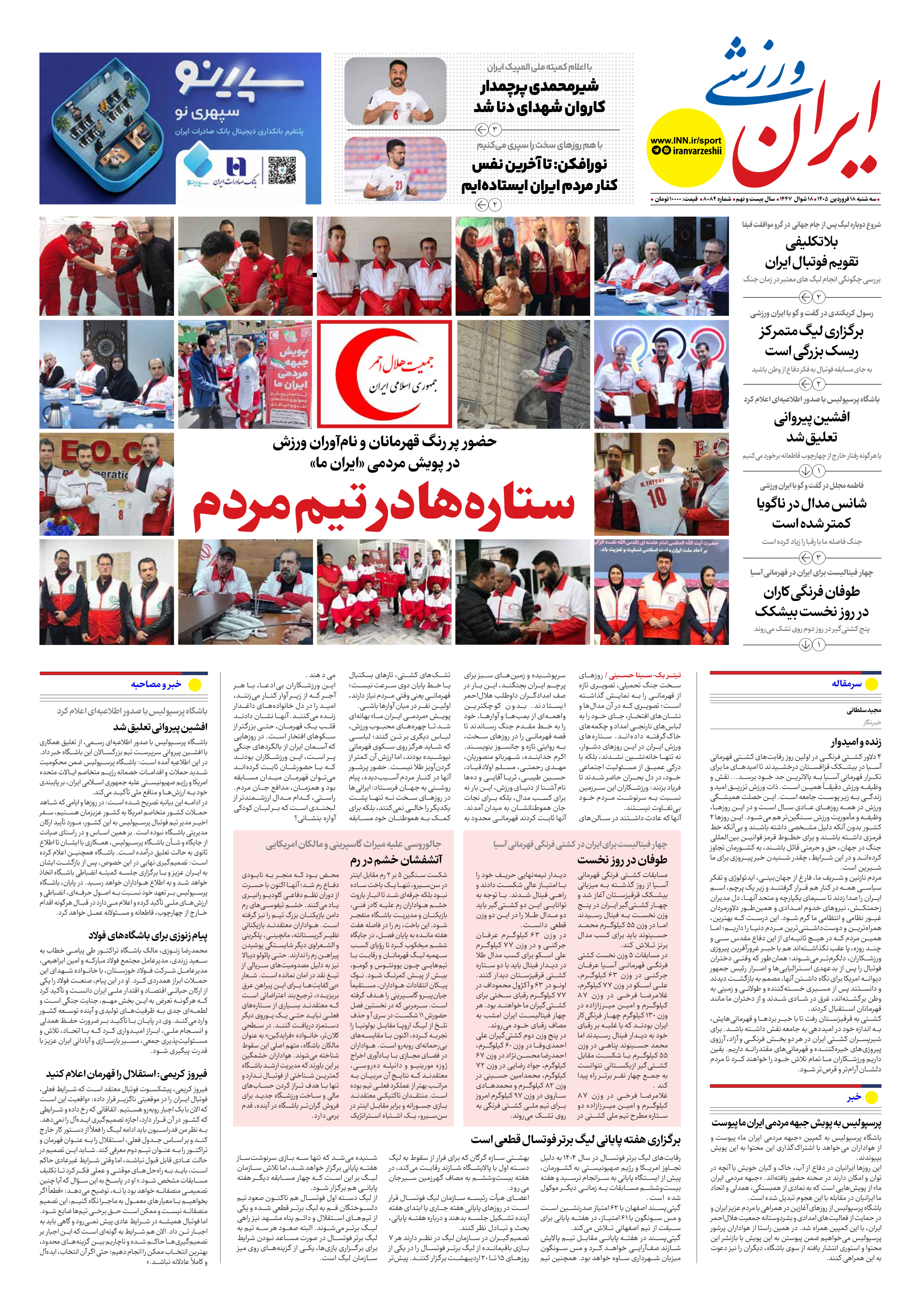 روزنامه ایران ورزشی - شماره هشت هزار و هشتاد و چهار - ۱۸ فروردین ۱۴۰۵