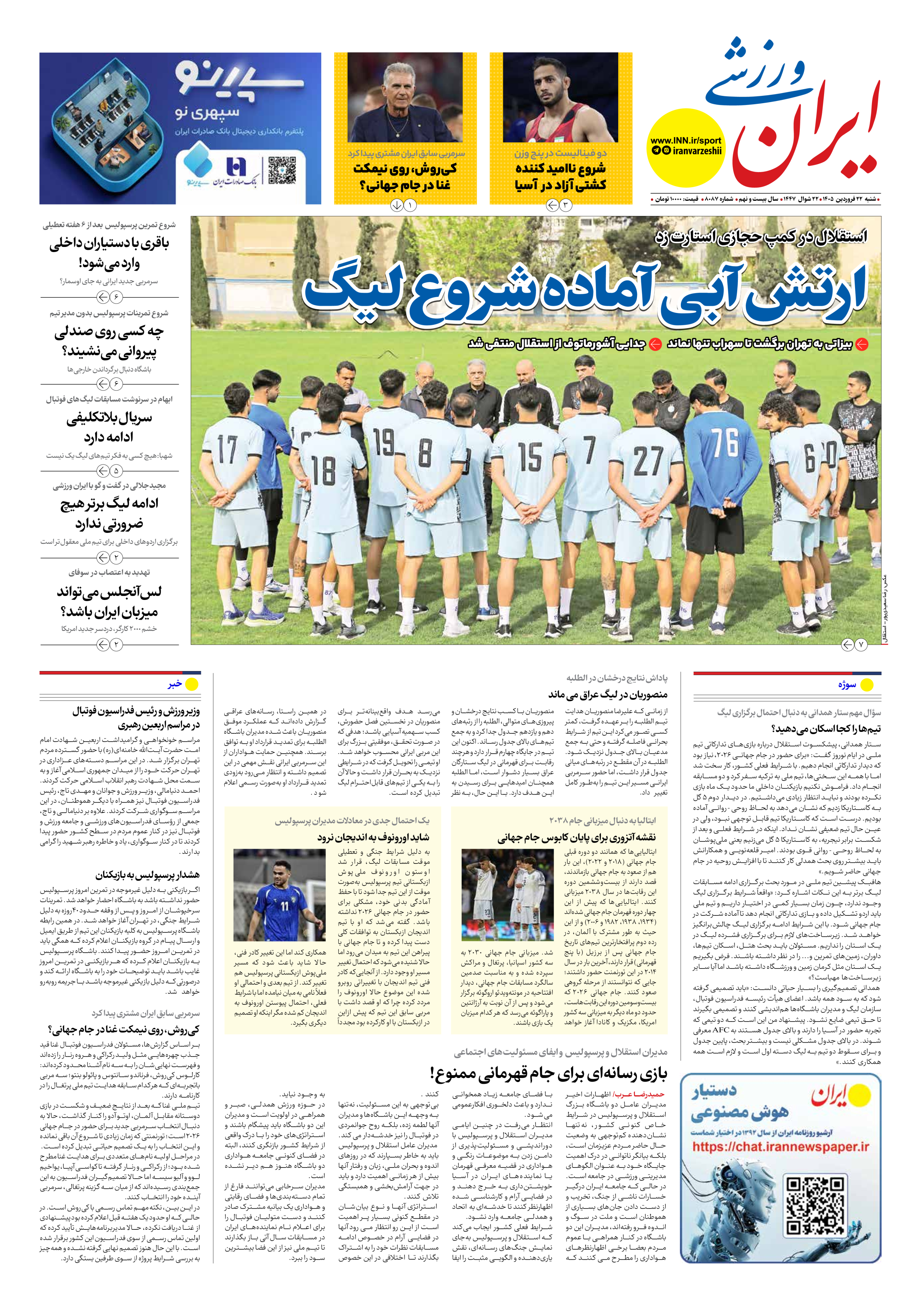 روزنامه ایران ورزشی - شماره هشت هزار و هشتاد و هفت - ۲۲ فروردین ۱۴۰۵